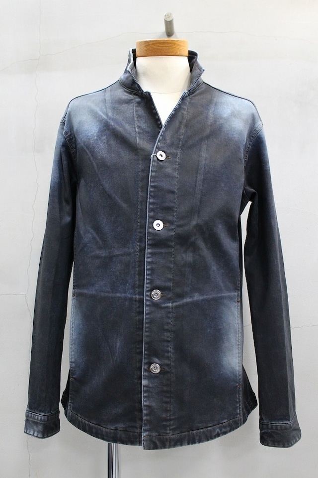 ハイストレッチのニットライクデニムを使用したスタンドシャツブルゾンです。ユーズド加工を施したベースに顔料を混ぜた樹脂コーティング剤を部分的吹き付け、所々プレス機でしっかり抑える事で縫い代の厚みがある部分や平たい部分に光沢を出して革の様な深い色味、質感に仕上げています。デニムシャツとGジャンを足して割ったようなライトアウターです サイズ48 バスト102肩幅46袖丈61着丈73 サイズ50 バスト108肩幅48袖丈62着丈75 コットン71%ポリエステル27%ポリウレタン2%