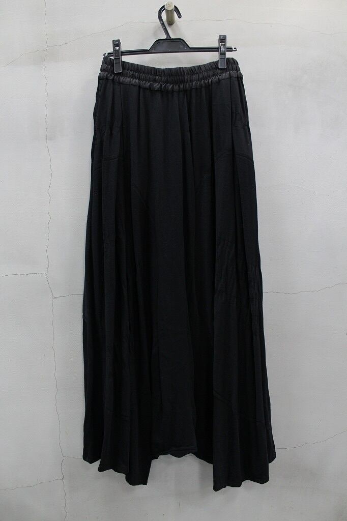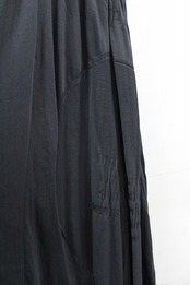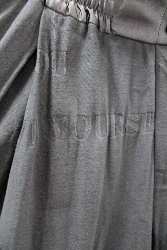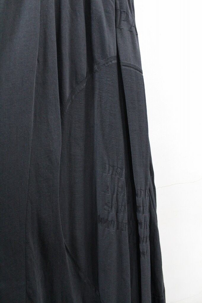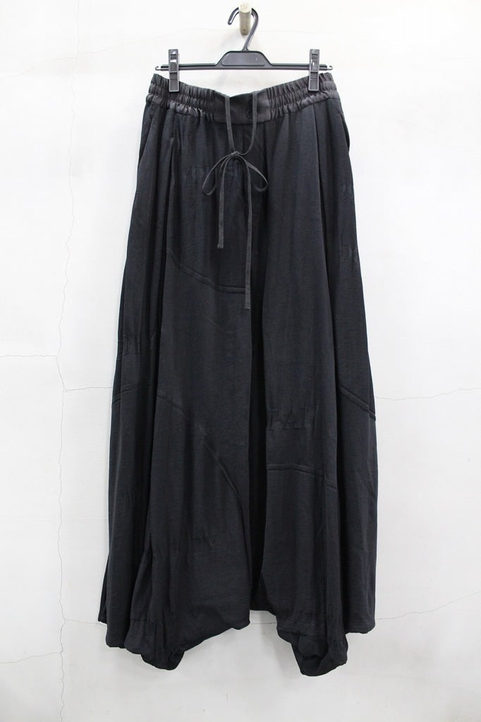 異番手のコットン糸を引き揃え編み立てたリンクスジャガードで柄も同時に表現。大きなピッチで柄を構成しているので、文字を含む柄の全体像ははっきりとは分らず抽象画のイメージでまとまっています。アイテム名にもあるように股上と股下が混同するような設定のデザインにより、スカートにも見えるような一本ですから、ユニセックスでオススメします