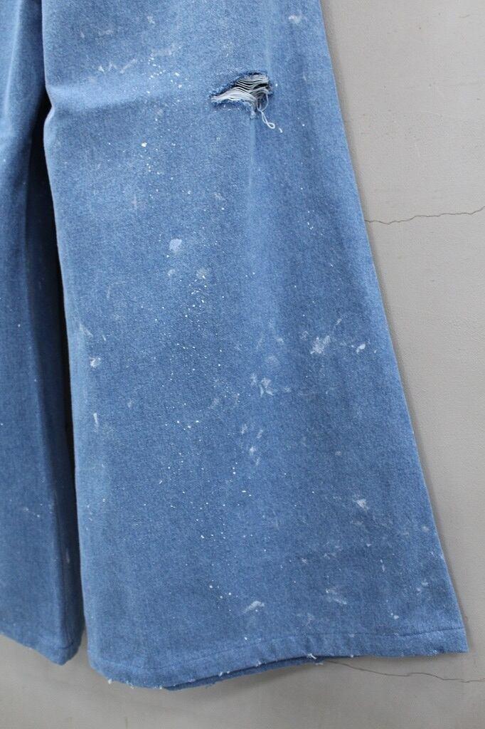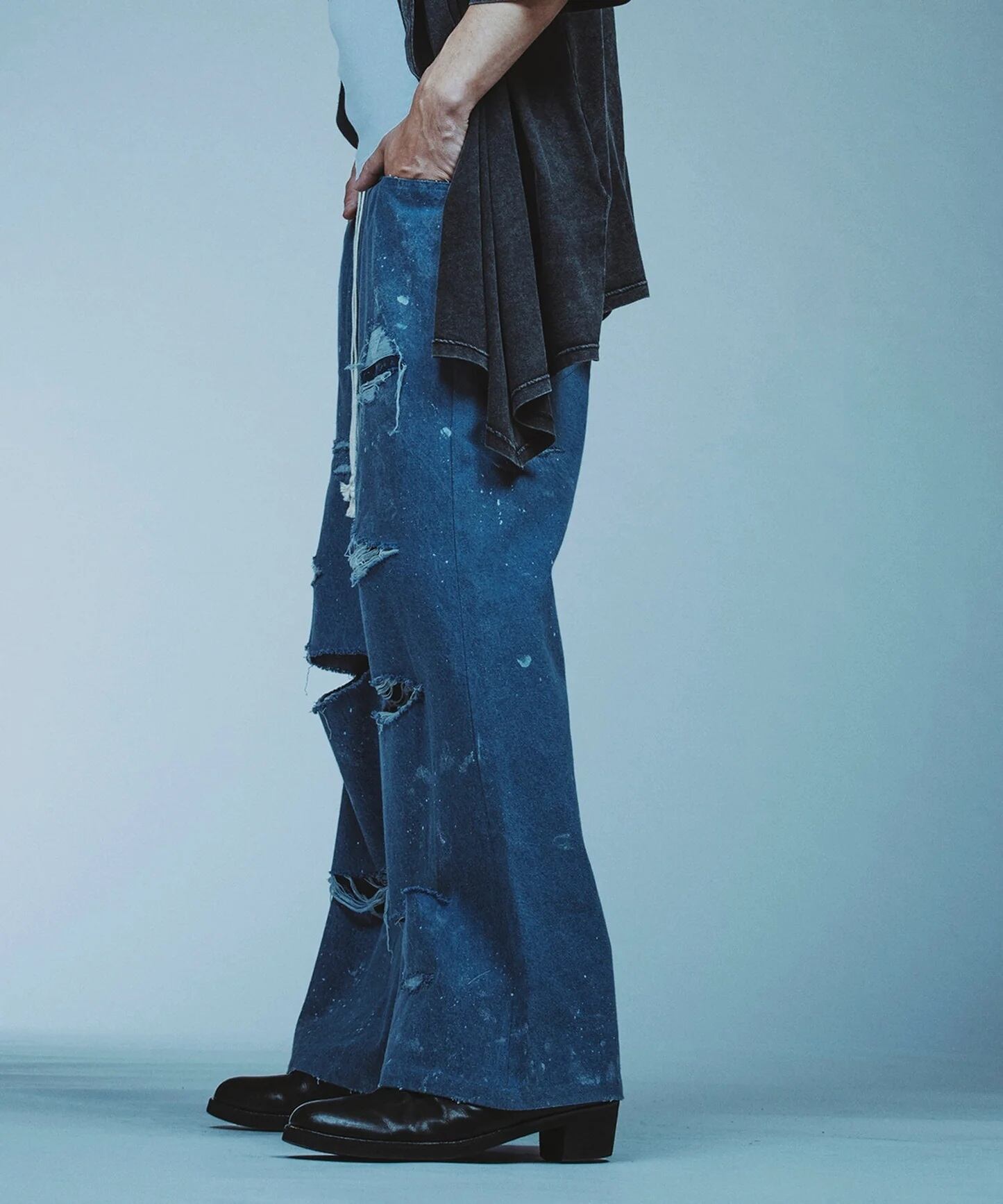 NOID×OVERDESIGNの別注企画。90年代グランジスタイルをイメージし、クラッシュ加工・ダメージ加工・リペア・ペイントなどハンドクラフトによるOVERDESIGNの技術が散りばめられた至高の一本です。シルエットは今の空気感を落とし込んだワイドフレアタイプになります