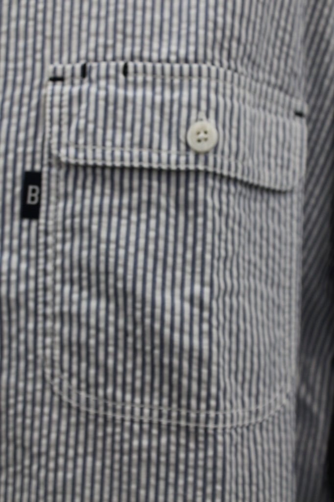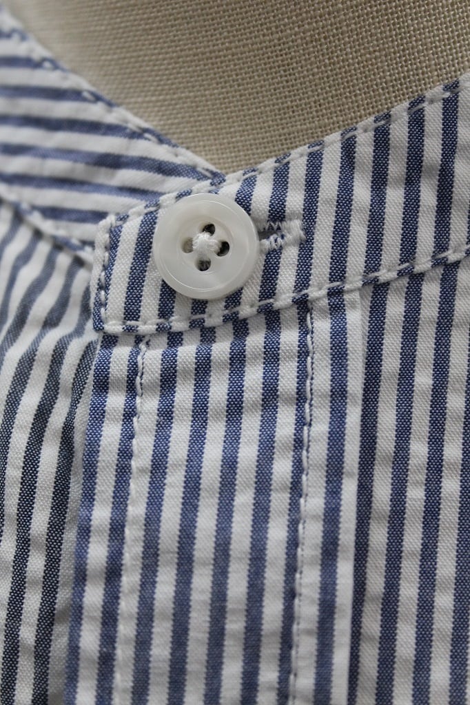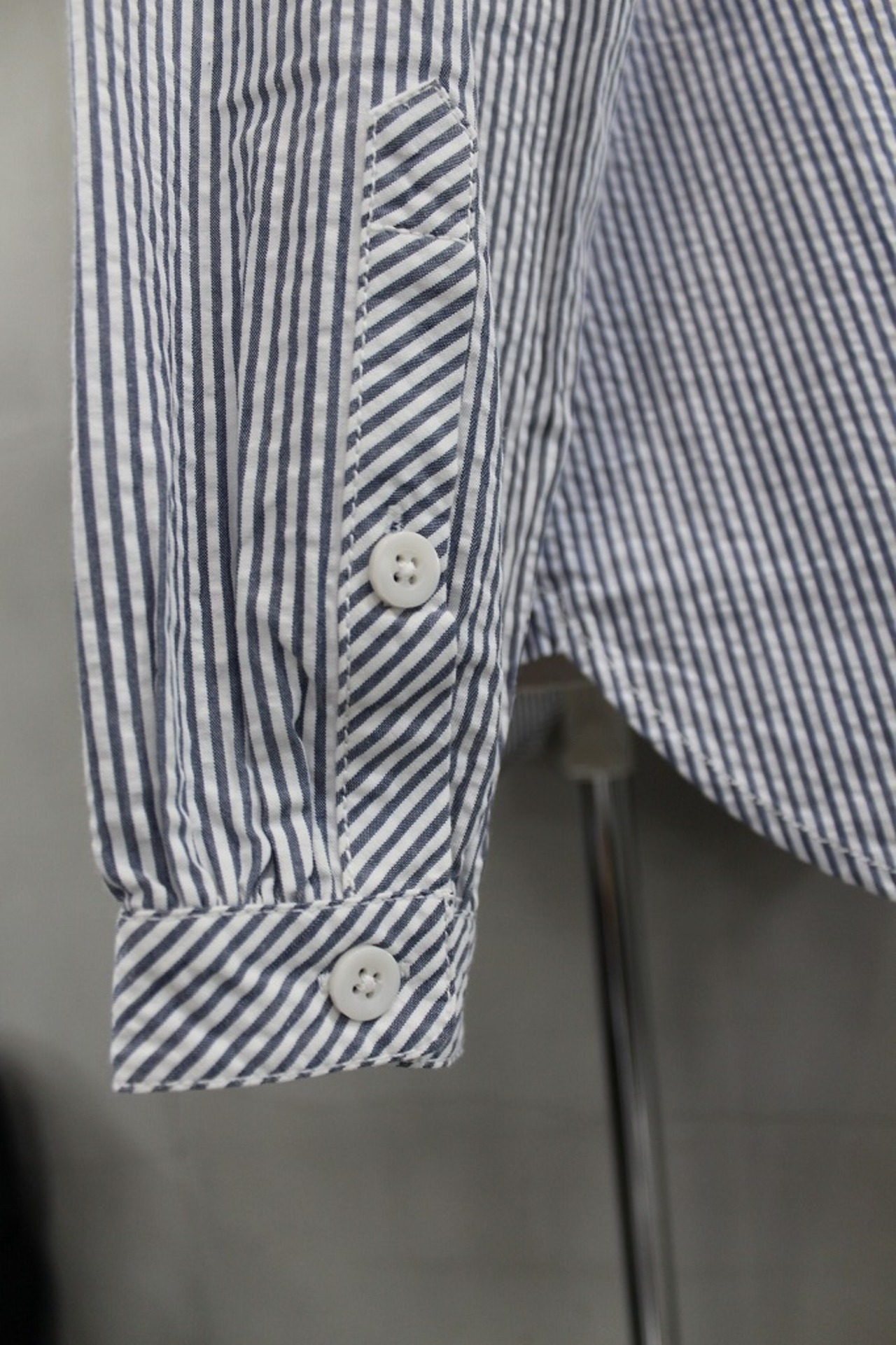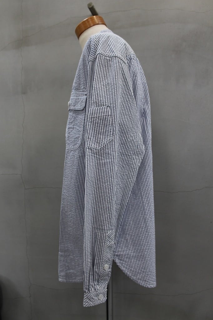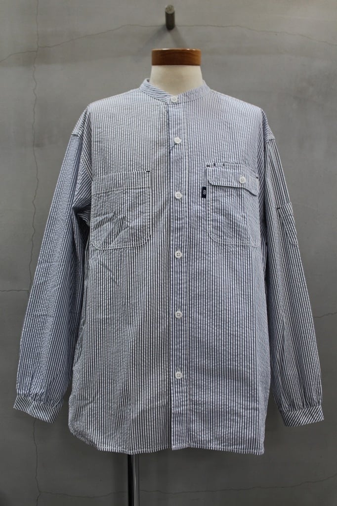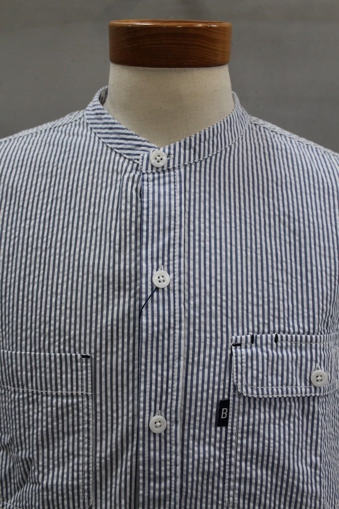 兵庫県産のサッカー生地を使用。肌離れのよい凹凸感のある生地感は暖かい季節に快適な着心地を発揮します。スッキリとした首元の印象のバンドカラー仕様にタフさと機能美に惹かれるワークディーティール。ワークシャツをタウンユースとして昇華させた1枚です
