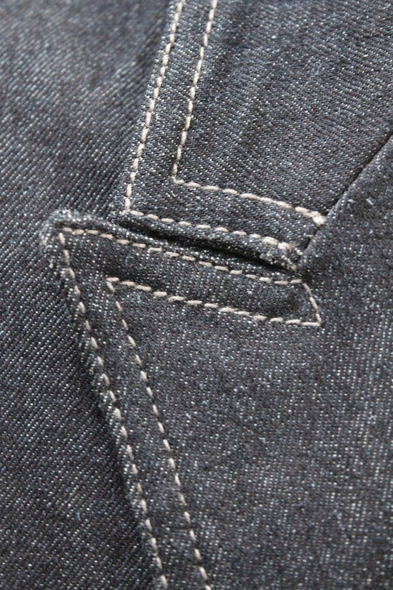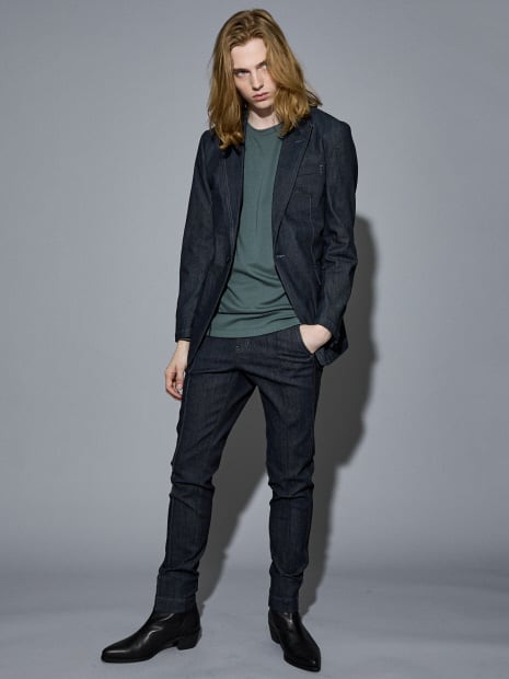 ワンウォッシュ加工を施すことで表面上の糊が取れ、適度なインディゴ染料も一緒に洗い流した使い勝手のいい9.1Ozストレッチデニム素材を使用。柔らかく、優れたストレッチ性で快適に着用いただけます。ブランドらしさが際立つピークラペルを取り入れた上品なデニムジャケット。グレーステッチで表情豊かに仕上げました。デザインのアクセントになる鳩目ボタンや、リベットでレザーパッチを留めたようなネック裏のディテールもポイントです。同素材のスラックスデニムパンツとのセットアップもおすすめです