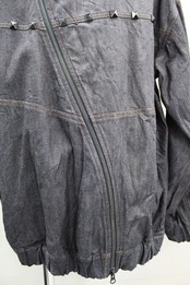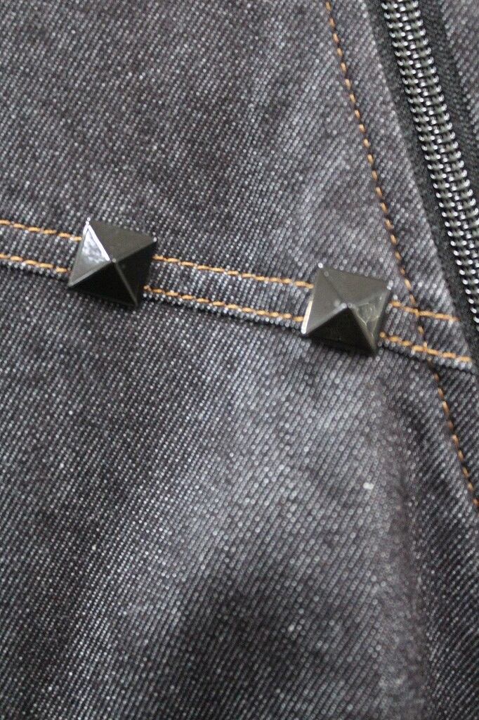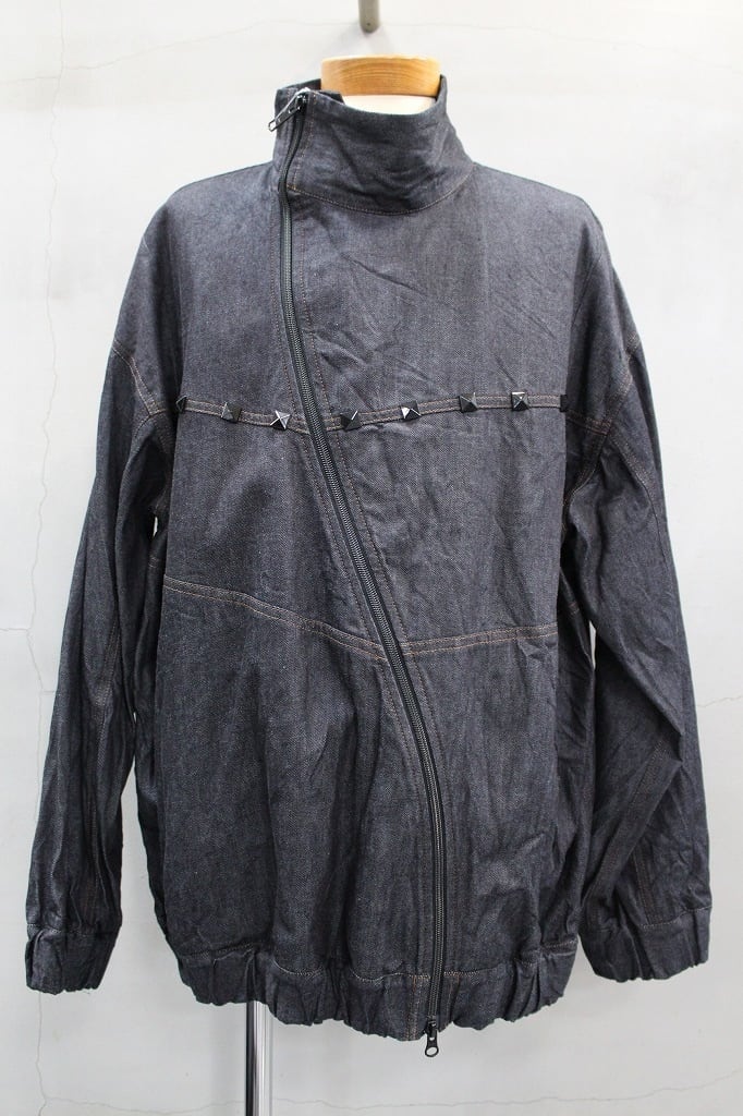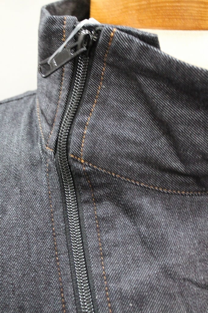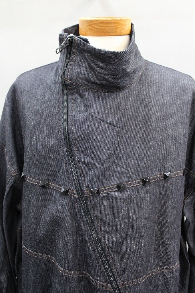 絶妙な厚みでオールシーズン着用でき、色落ちが少ないことが特徴の8オンスデニムを使用したデニムジャケットです。立体的なハイネックと斜めに走るファスナーラインがモードな印象。胸元にあしらったピラミッド型のビーズがアクセントになっています