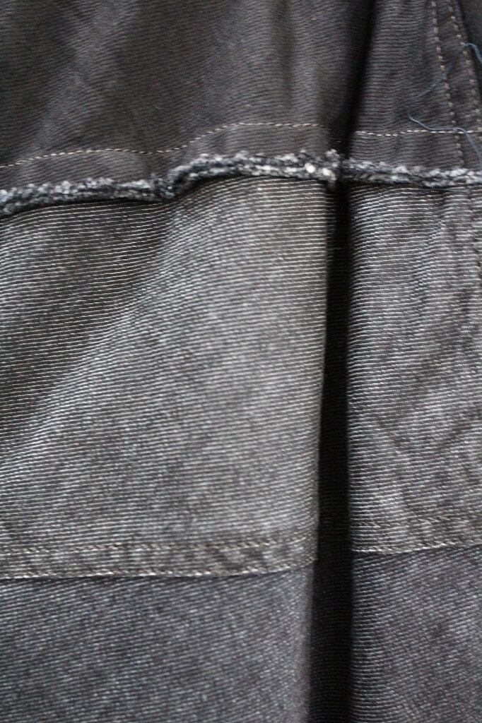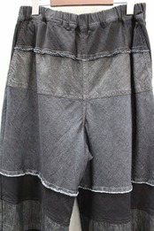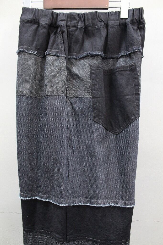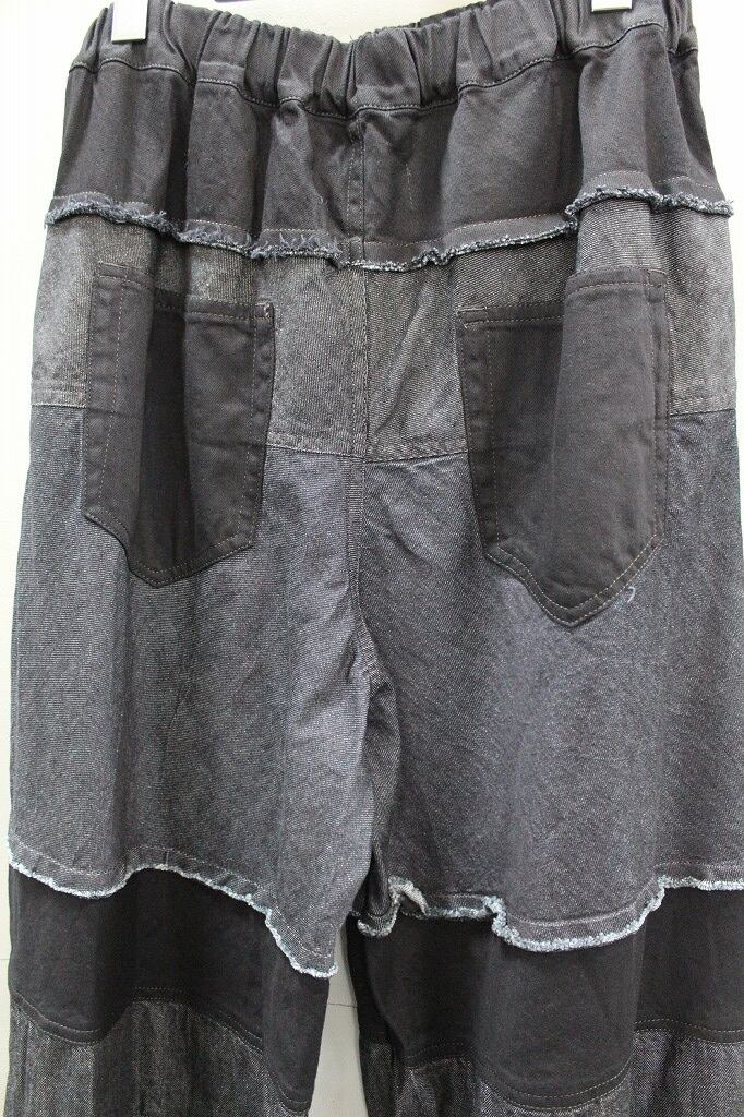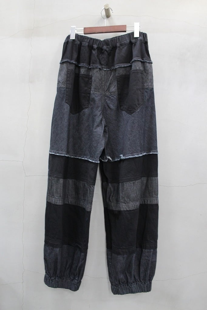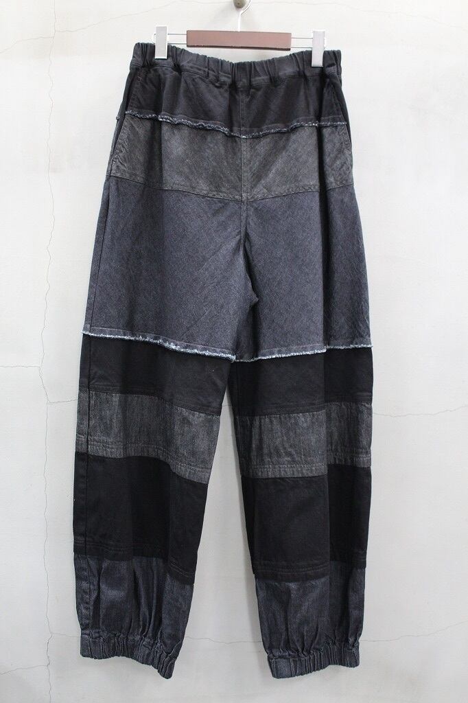 絶妙な厚みでオールシーズン着用でき、色落ちが少ないことが特徴の8オンスデニムをベースに配色切り換えを施し、リメイク風に仕立てたパンツです。断ち切りデザインがアクセントになりながらラフでワイドなシルエットながらも、裾のゴムでスッキリとした印象に仕上がっています。