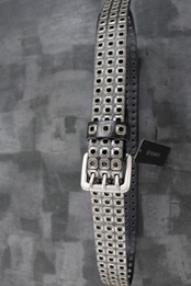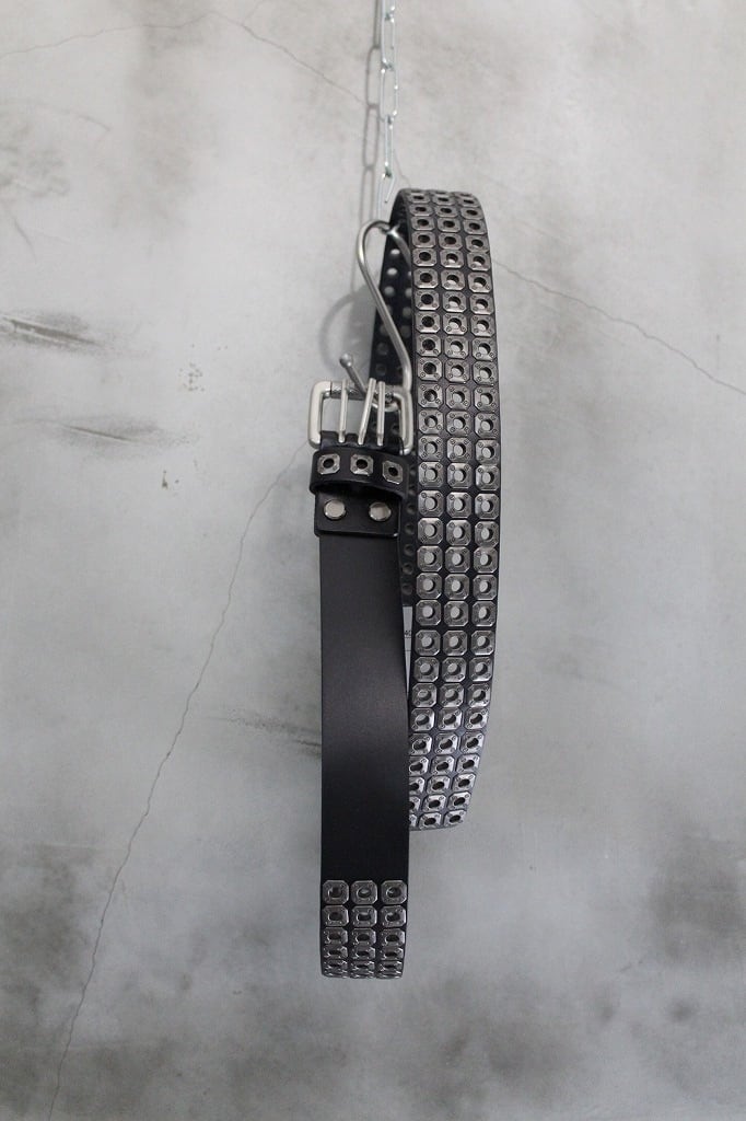 3連のピンを配したバックルが重量感のあるベルト。メタリックなハトメがベルトのほとんどをを占め、ハトメにトリプルピンを通すことでFREEサイズ仕様になったベルトです。ネジ式でベルトを外し、カットしてのサイズ調整も可能です