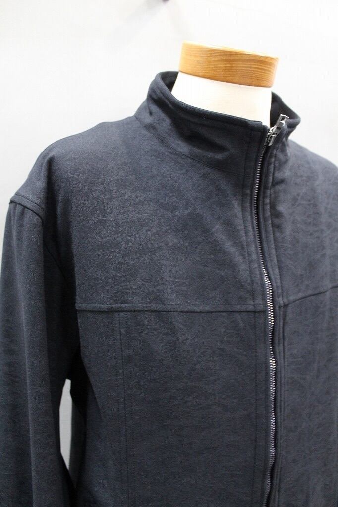 ナイロンジャージのゴムのように伸縮する2WAYストレッチ素材をベースにリアルレザーの様なシボ感をエンボス加工して素材感を表現した国産素材を使用。シンプルで定番的なシャープなシルエットのショートスタンドブルゾンに仕立てました。オリジナルボタンなどにも拘り、スタンド襟端に通ったワイヤーがさりげなく便利です