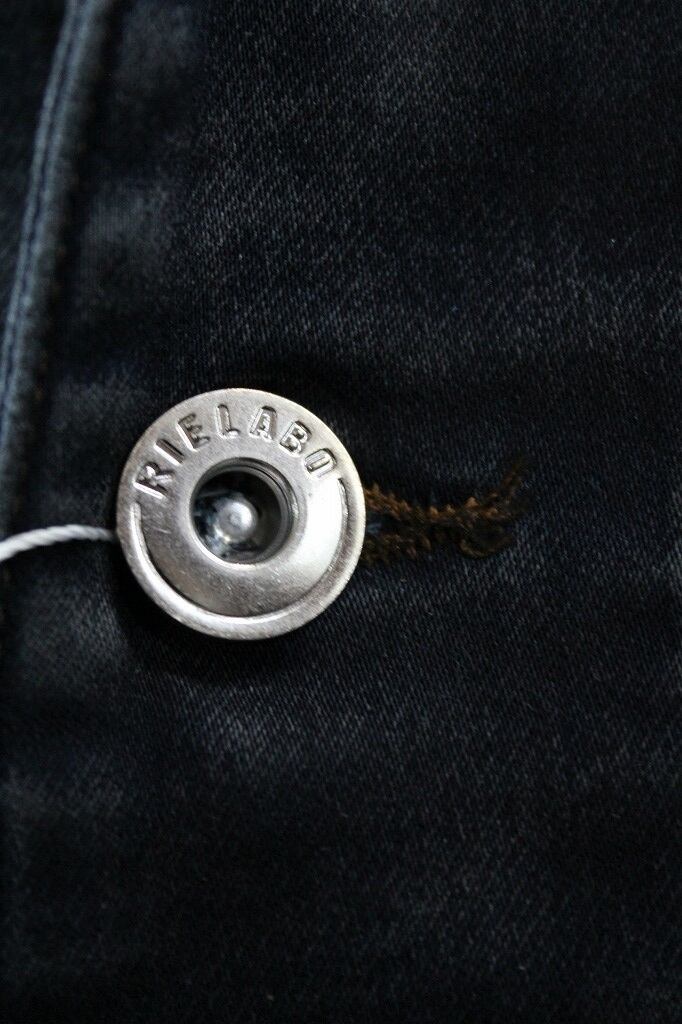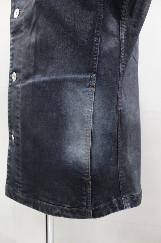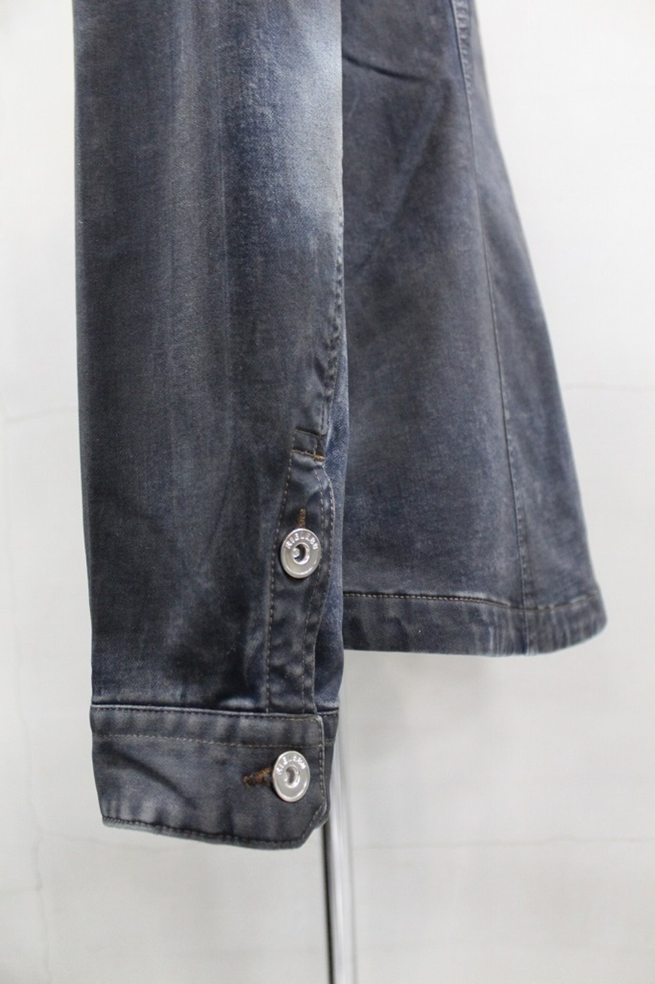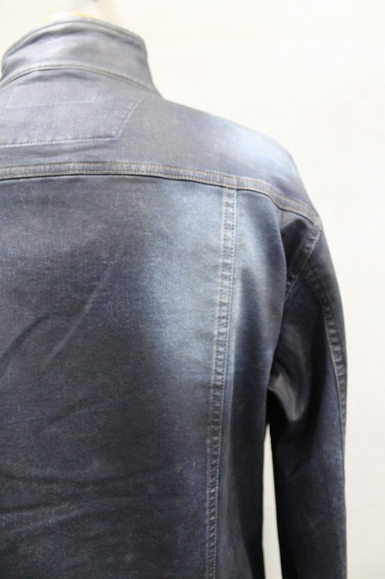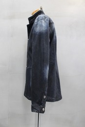 ハイストレッチのニットライクデニムを使用したスタンドシャツブルゾンです。ユーズド加工を施したベースに顔料を混ぜた樹脂コーティング剤を部分的吹き付け、所々プレス機でしっかり抑える事で縫い代の厚みがある部分や平たい部分に光沢を出して革の様な深い色味、質感に仕上げています。デニムシャツとGジャンを足して割ったようなライトアウターです