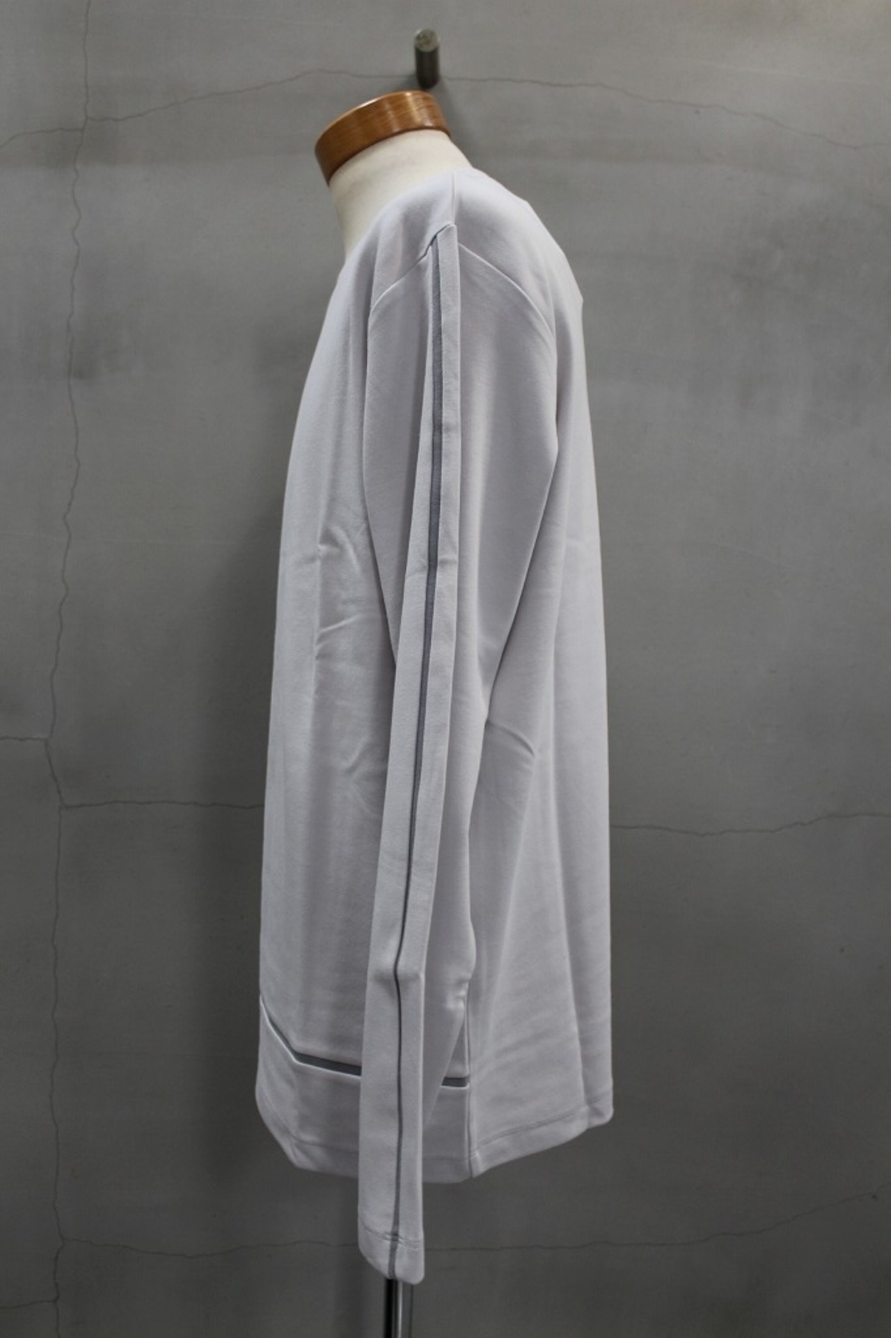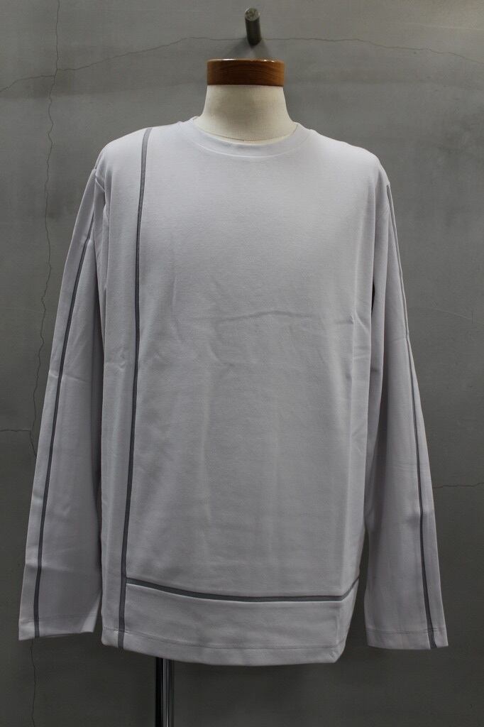 動きにしっかり追従するストレッチ性が特長のスムース素材を使用。LラインTシャツ という名で半袖ベースのタイプも企画が続く、シーズンを通して人気のデザイン。秋冬シーズン新作のこちらは身頃のLラインに加えて袖にもラインが施されたロンTEEです