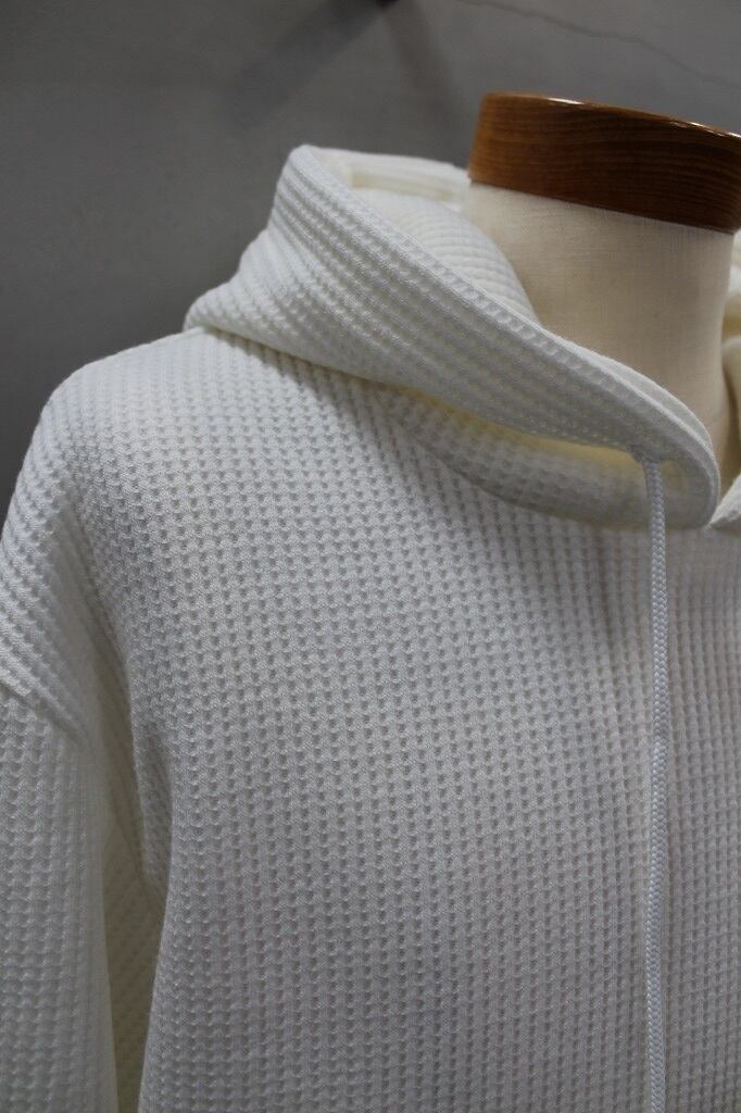 MAISON HONOREのロゴは再生のシンボルである魚。魚とハートをMIXしたハートフィッシュを刺繍したワンポイントが人気のワッフル織りのサーマル素材を使用したフーディ。大きすぎずのゆとりあるサイジングでこなれた抜け感を演出しつつ上質な素材とシルエットでラフになりすぎない大人なアイテムです。