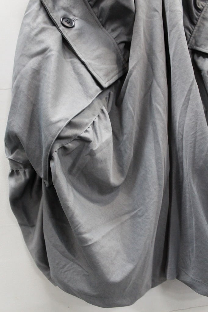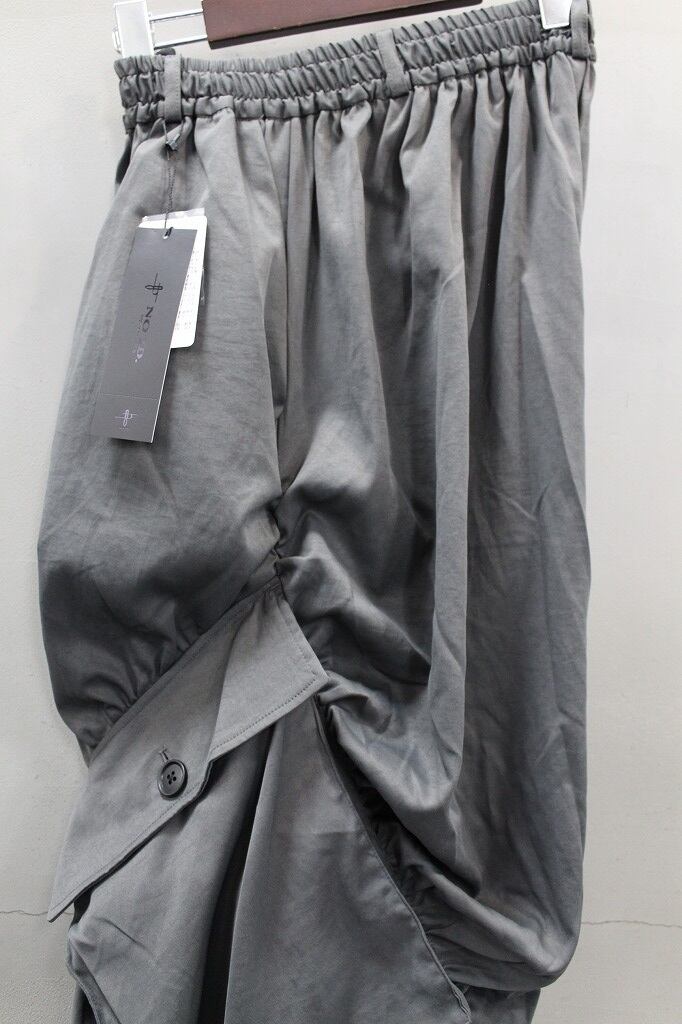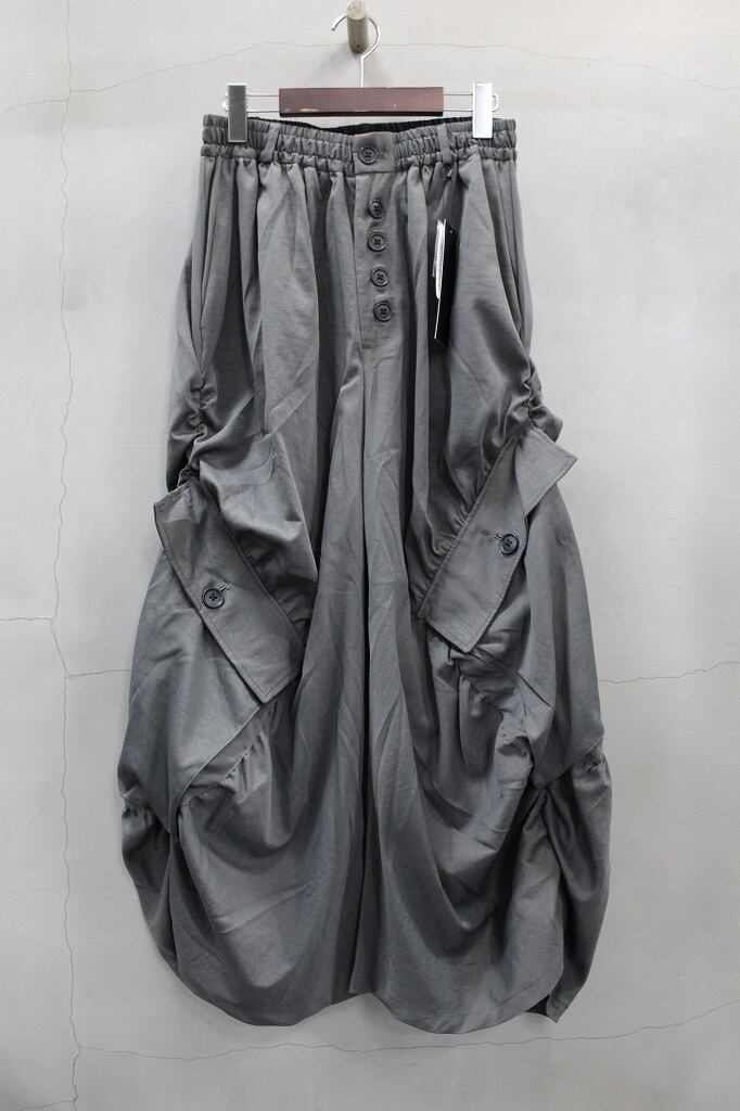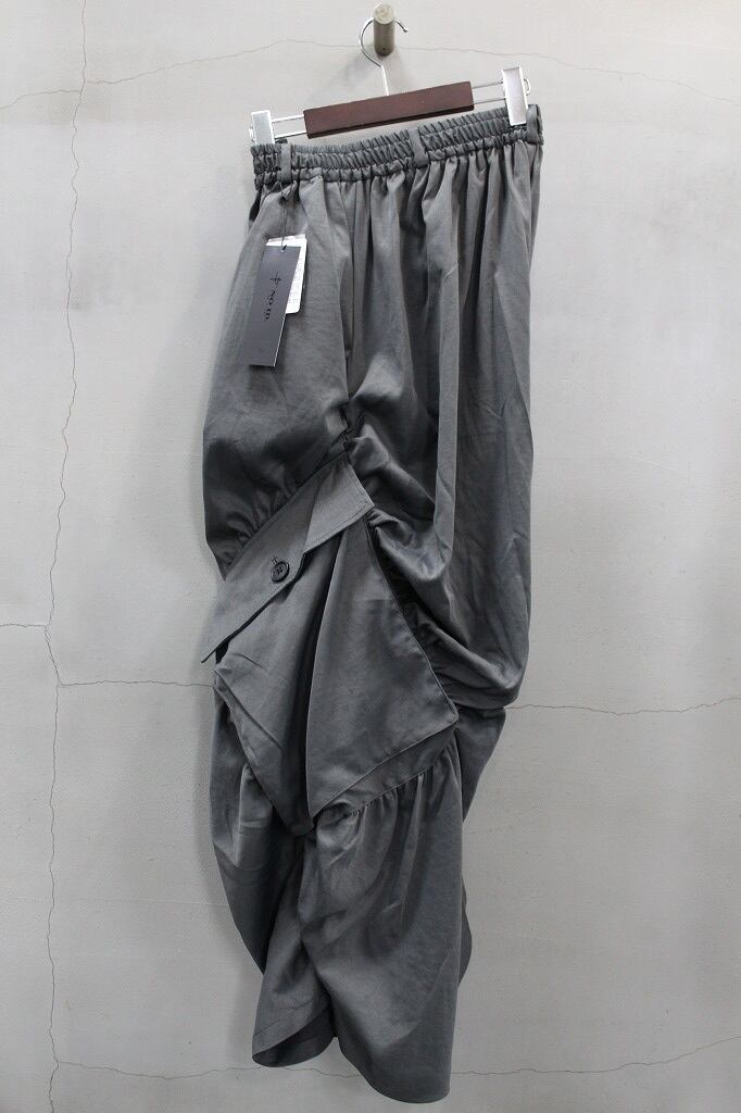 ミリタリーウェアの雰囲気をモードな解釈で落とし込んだ個性あるカーゴパンツ。サイドに施したギャザーシームがシルエットを変化のあるシルエットを生んでいます