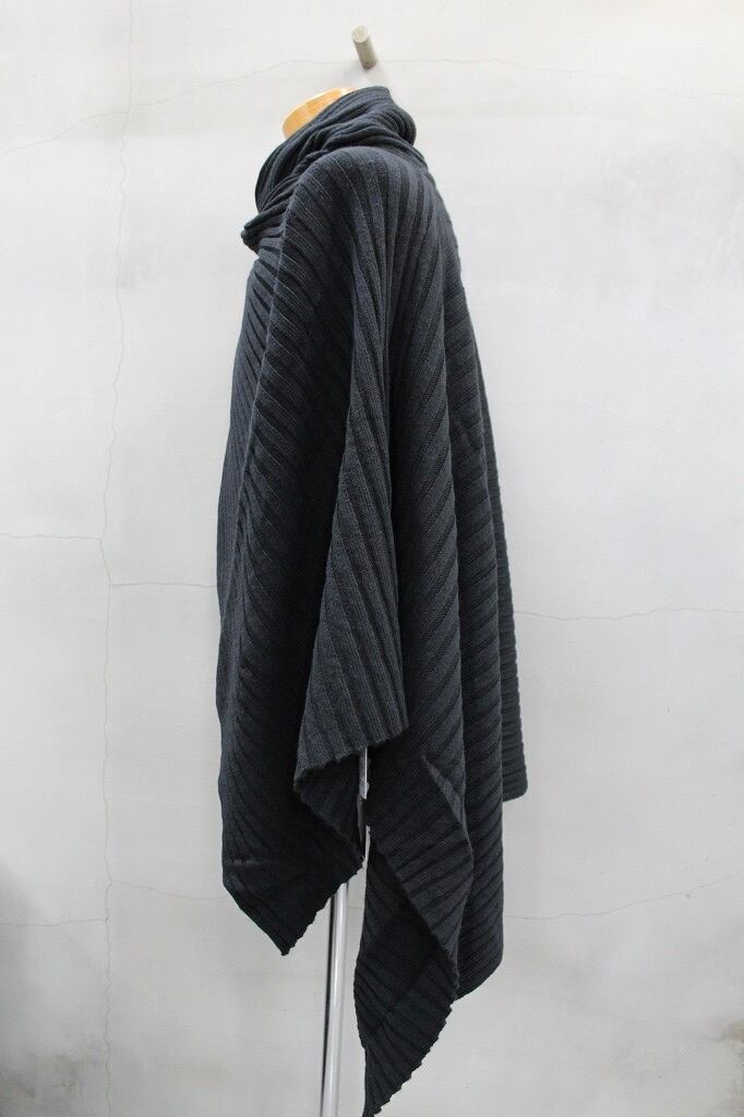 着用は頭を通すだけ。ネックラインをツイストすることでモードな装いに昇華したニットポンチョです。リブ編みの暖かみのあるニット地を使用。被る向きを変える事で様々な表情を楽しめるようになっています