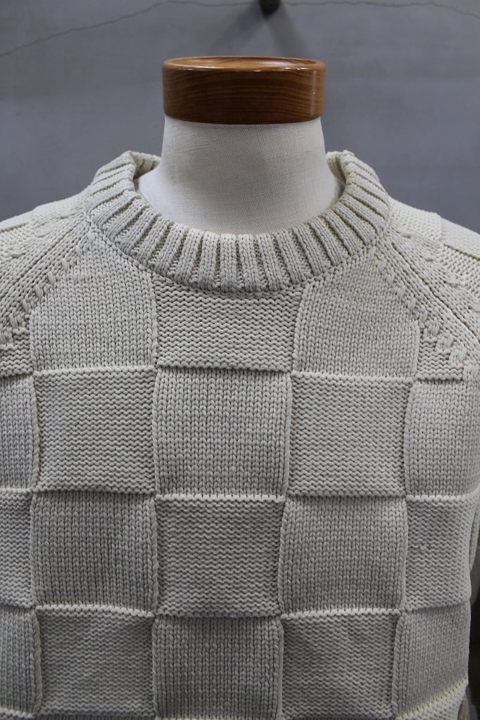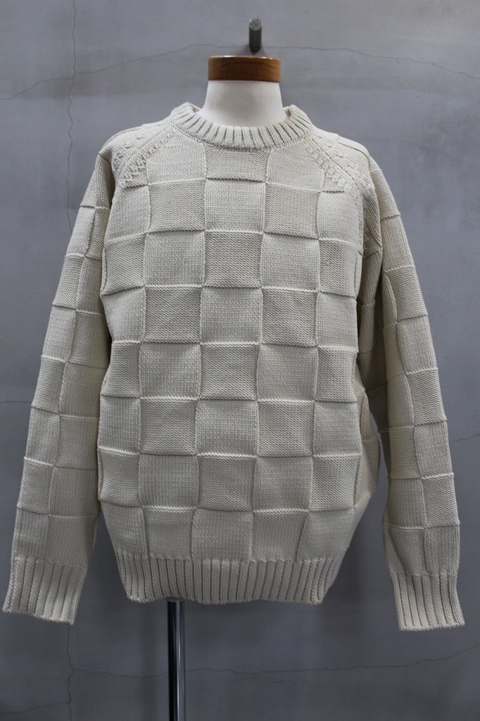 太番手の糸でふっくらと織り上げた凹凸のはっきりしたイントレチャート柄のニット。リサイクルポリエステルとは思えない上質な質感と雰囲気を醸し出せた上品なニットです