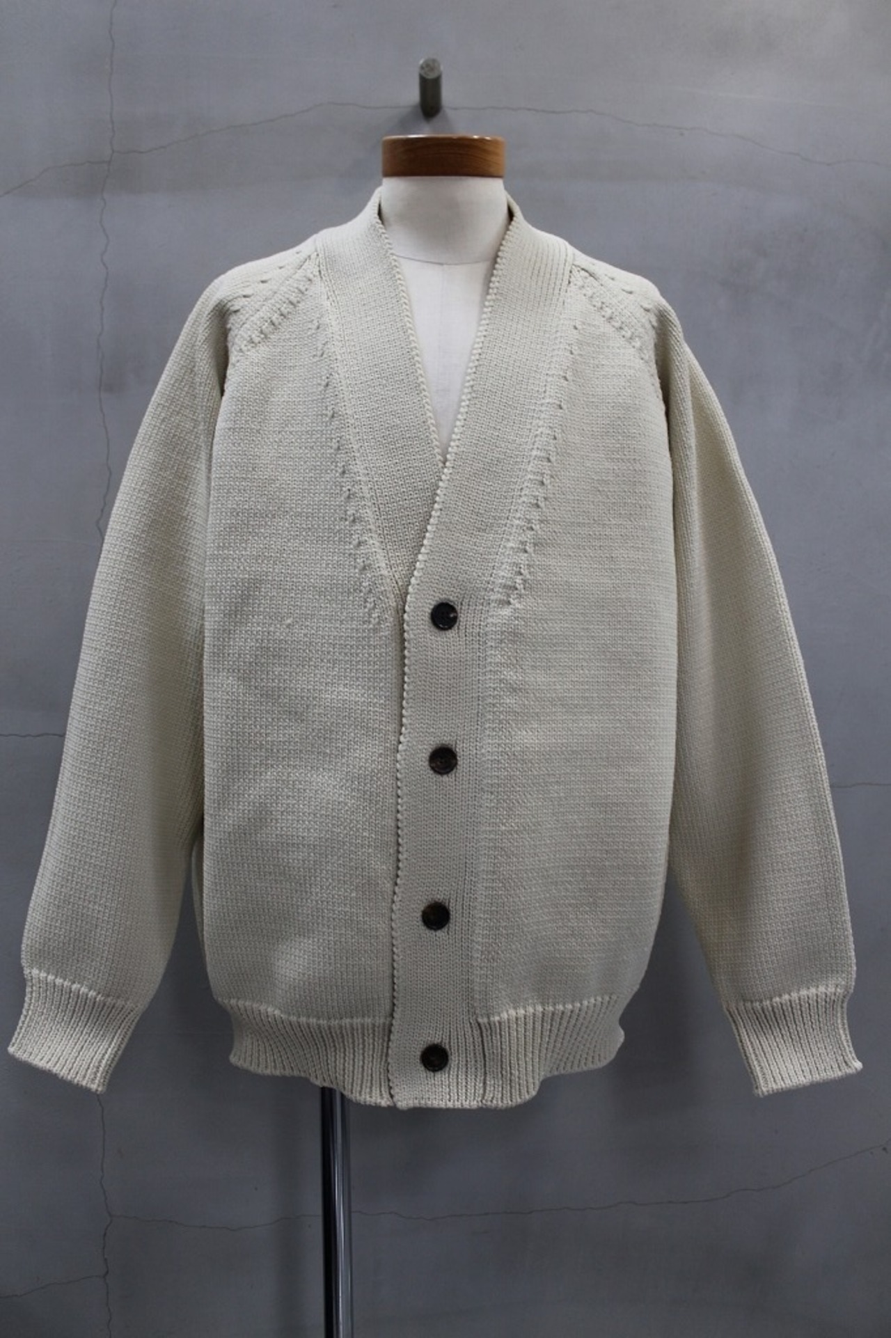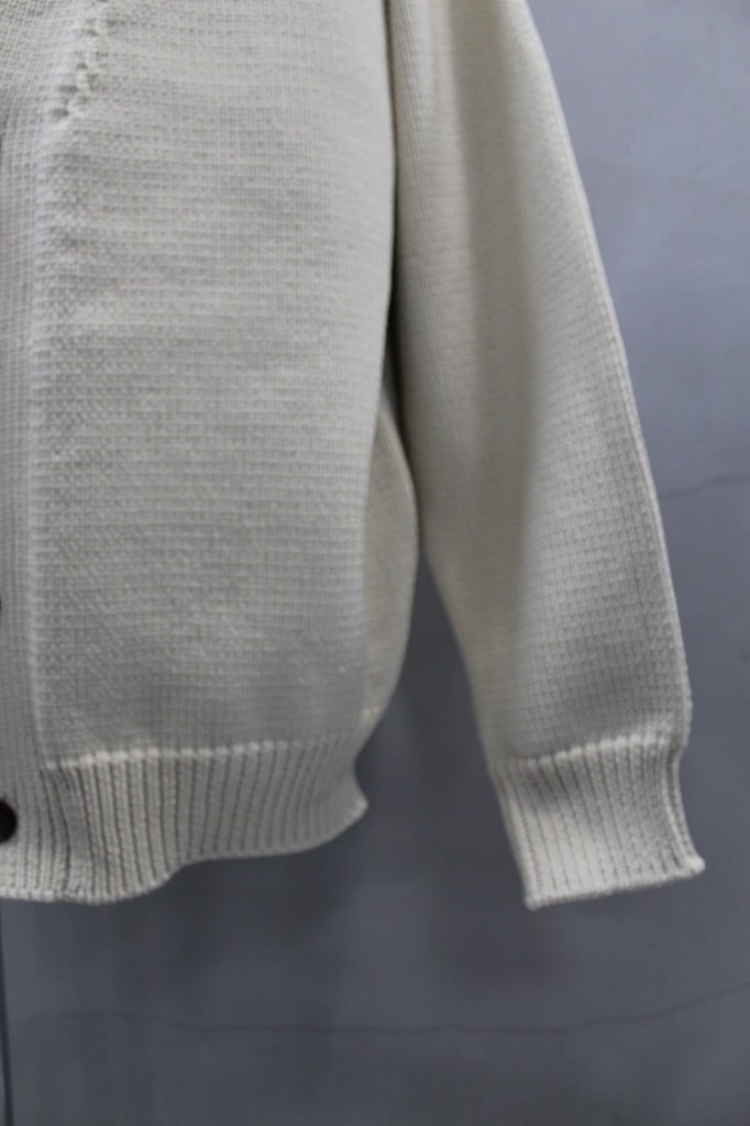 太番手の糸でふっくらと織り上げた天竺織りのニットカーディガン。膨らみのあるシルエットが特徴のシンプルなカーディガンです。本水牛ボタン使用。