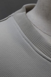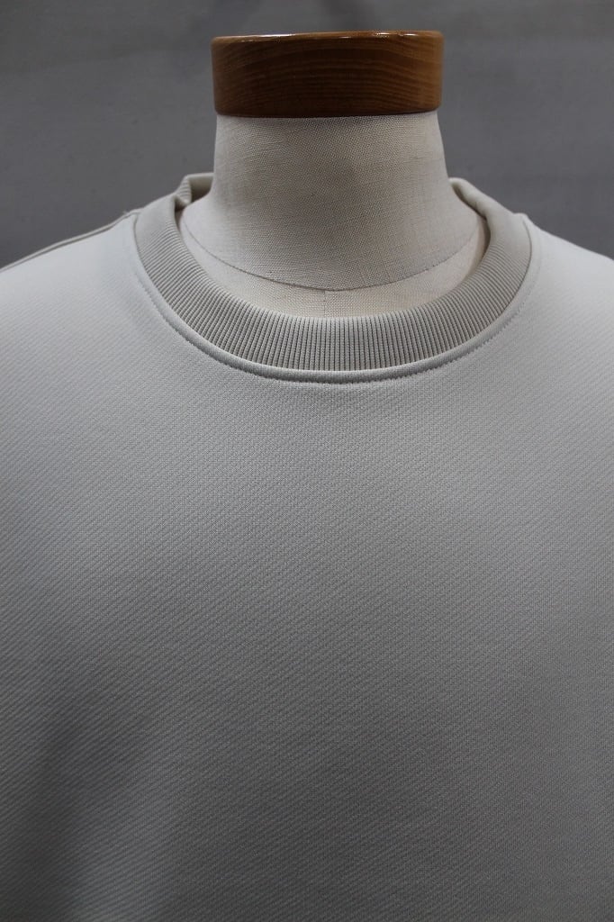 表面はポリエステルフィラメント糸使用で従来の裏毛よりもスポーティさを演出し、裏面はコットン100%で裏毛独特の肌触りの良さと膨らみをだした新素材キャノンループを使用したクルーネック。裾にはスピンドルを通しており、シルエットの遊びを取り入れたデザイン。サイドシームポケット付きが何気にうれしい。37,5度モックネックをインナーに合わせてモックとクルーのレイヤードもおすすめです