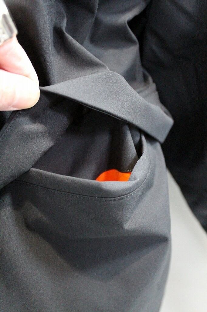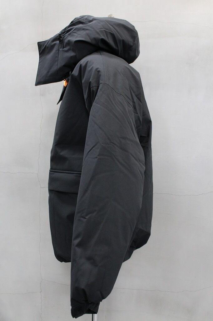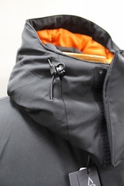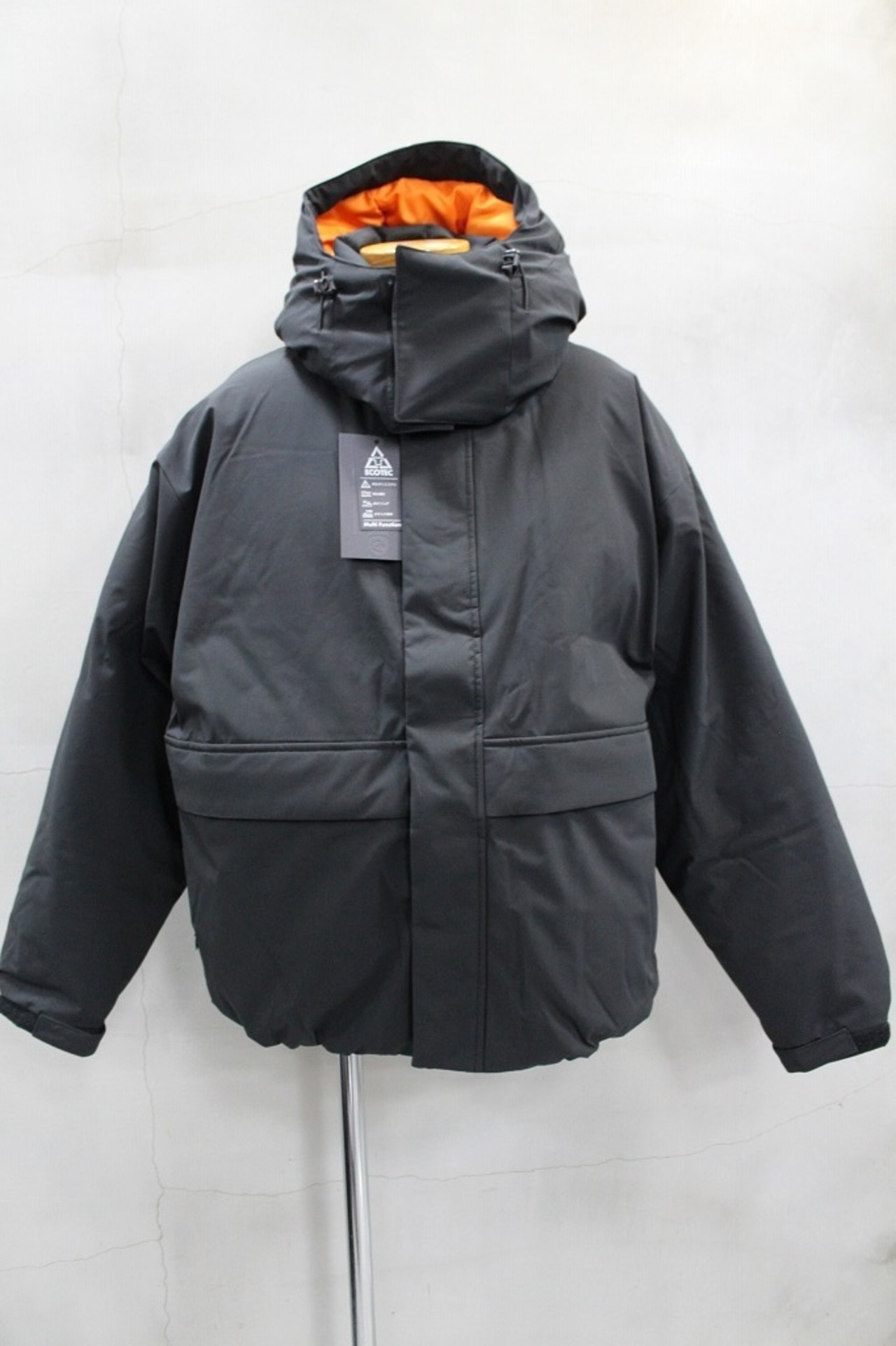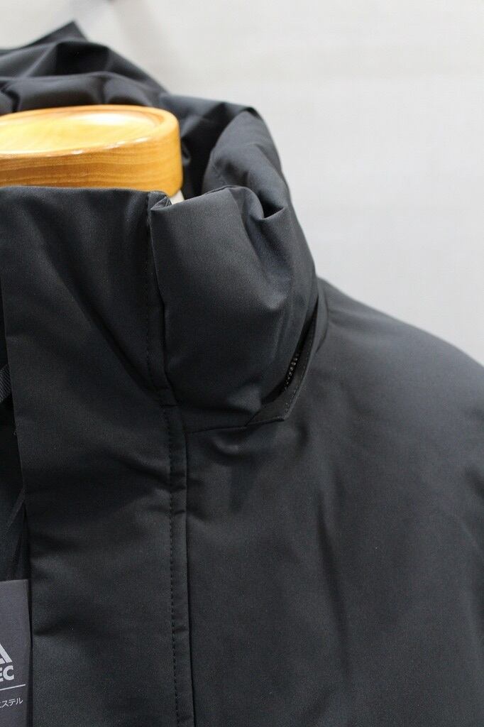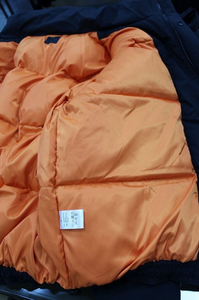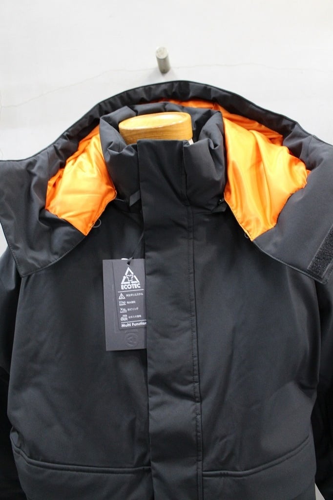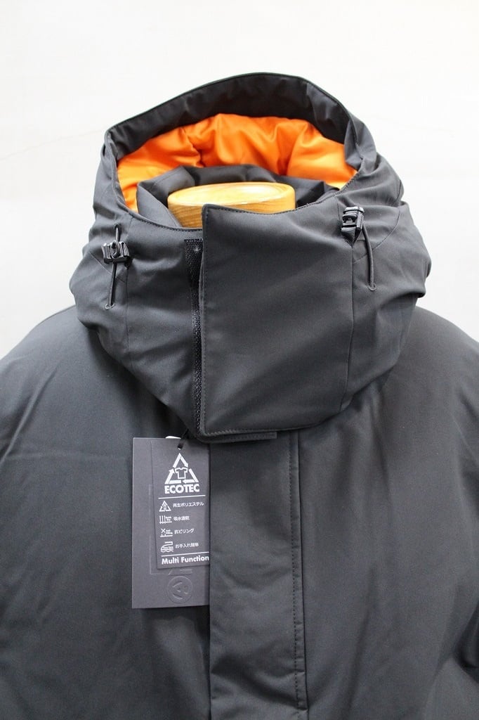 フラップ付きのポケットとスラッシュポケットでの2重ポケットは機能性も抜群。フードの取り外しを可能にするアジャスター付きなで、スタイリングに合わせた着用が可能です。ECOダウンシリーズ共通のMA-1をイメージした裏地配色オレンジがアクセントになっています
