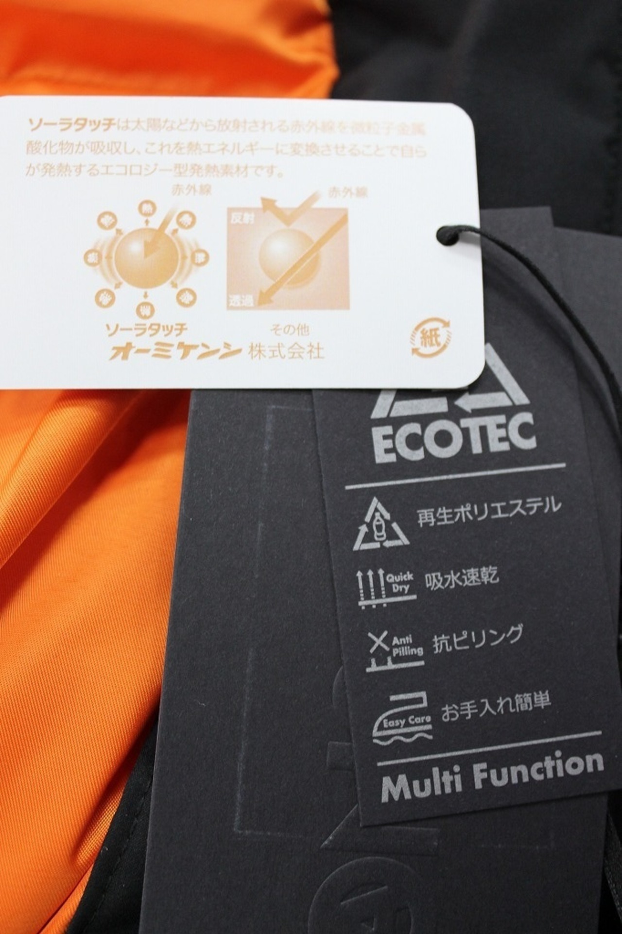 高機能でハリコシのある素材を使用しています。中綿には環境配慮の観点から天然ダウンを使わずにリサイクルポリエステルから作成した発熱機能ファイバーフェイクダウンであるソーラータッチを採用し、ブランド理念に基づき企画されたダウンブルゾンです