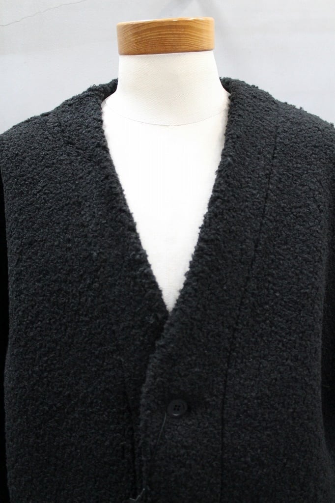 ウールを混紡した表情豊かなボア素材を使用したカーディガンジャケット。毛足の長いボアでボリュームのある見た目に反しての軽さが特徴です。ゆったりしたシルエットにサイドにポケットを設け、アウター感を強めています