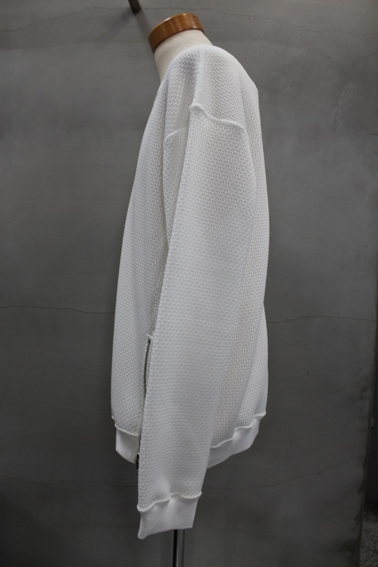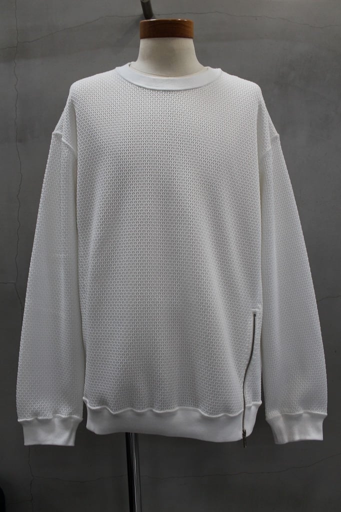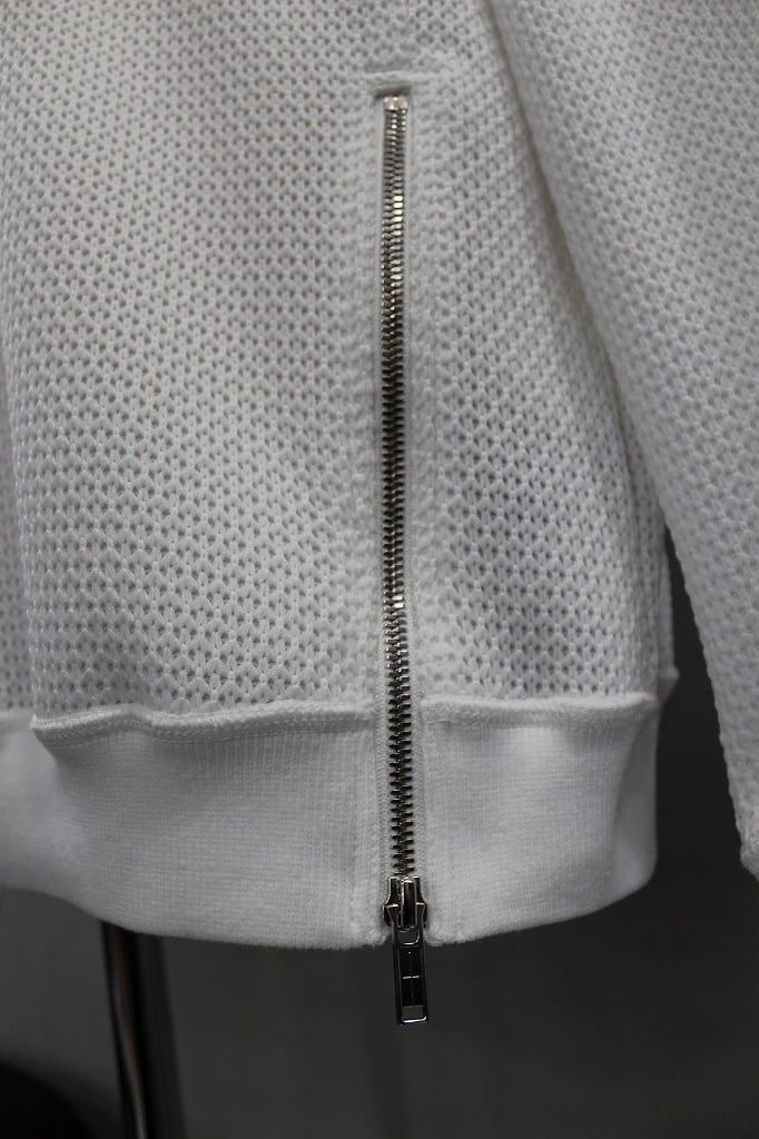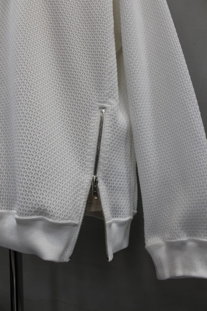 表は8ゲージ、裏は32ゲージのローゲージ✕ハイゲージを組み合わせた表面感と肌触りの表裏異なる追及をかたちにしたプルオーバーです。左裾のオリジナルファスナーを開閉することでシルエットの調整やインナーレイヤードで遊べる仕様になっています。オリジナルファスナーはYKK最高級品のEXCELLAを使用し、引手は別注制作したオリジナルの引手をセットしました