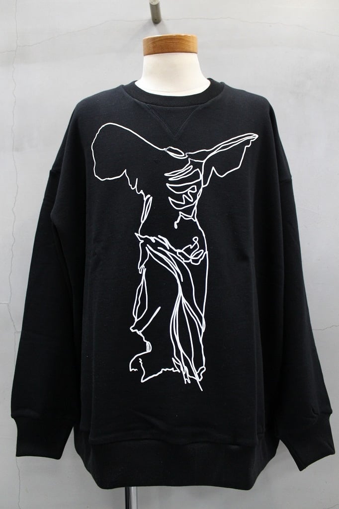 GOMMEで長年人気を誇り,定番ともいえる上質なコーマ糸を使用した裏毛ニットを使用。今季のテーマ「ギリシャ」を基に、デザイナー自らが線画で“サモトラケのニケ”を表現したオリジナルプリント。カジュアルながらどこかモードかつシックな印象になったBIGシルエットトレーナーです