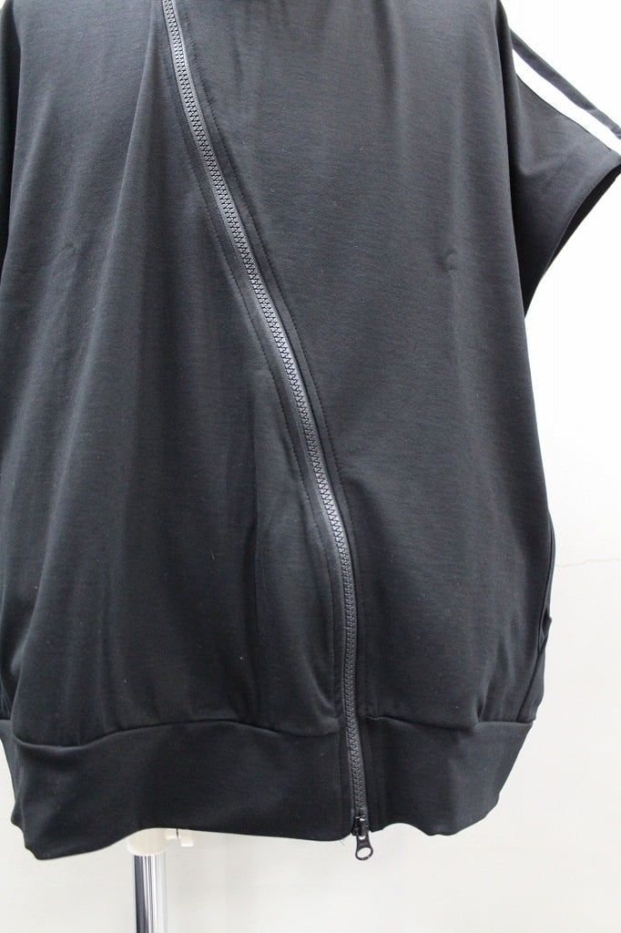 斜めに走るフロントジッパーがポイントのカットベスト。肩から袖口にかけてドローコードが配され、シルエットの変化を楽しめるデザイン。袖はゆったりとしたフレンチスリーブ風で、抜け感のあるフォルムが魅力。肩にラインを施し、スポーティ要素をプラス。便利なポケットが付き、カジュアルに着まわしやすい一着です