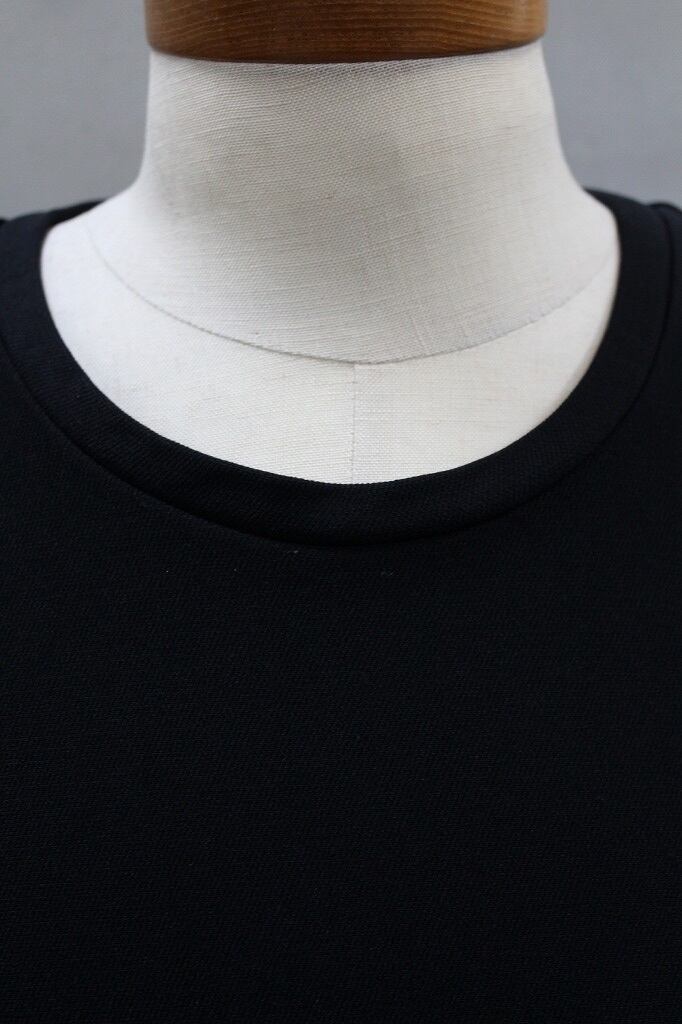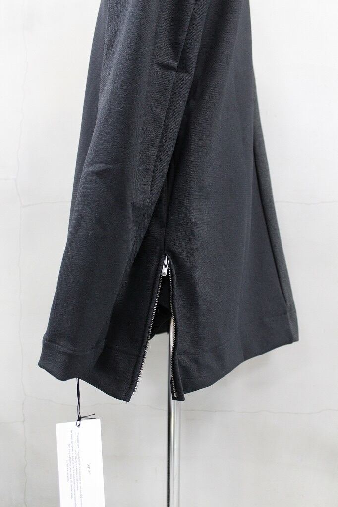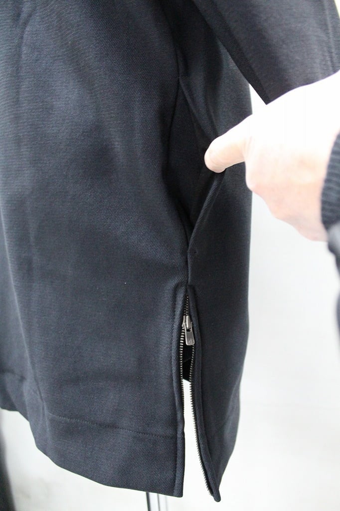 先染めデニム見えの表面感が味のある裏起毛ハイテンションスーパーストレッチ素材を使用。ハリコシのあるナイロンとポリエステル糸を使用し、しっかりとしたボリューム感がありながら動きに合わせてストレス無く伸縮する抜群のストレッチ性が魅力的な素材です。ロング丈のクルーネックタイプ設定で、両サイドにエクセラジップを配しサイドスリットで変化を付けれる仕様。背中の「b.」プリントがアクセント