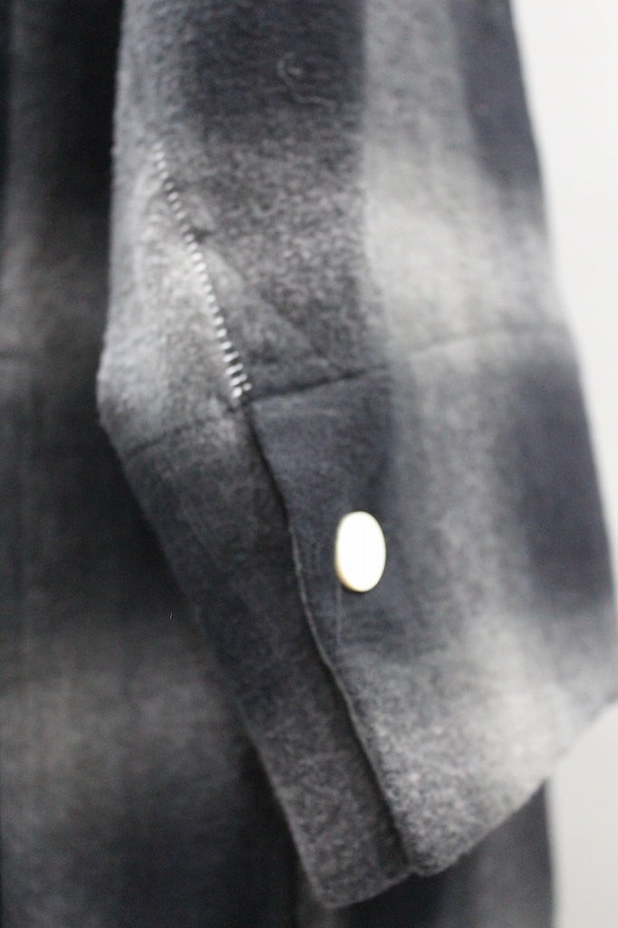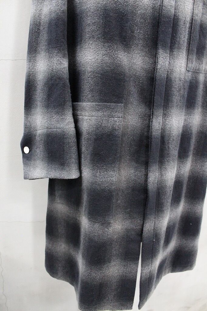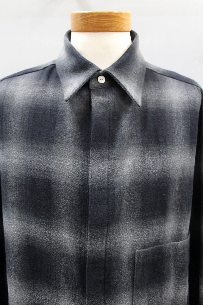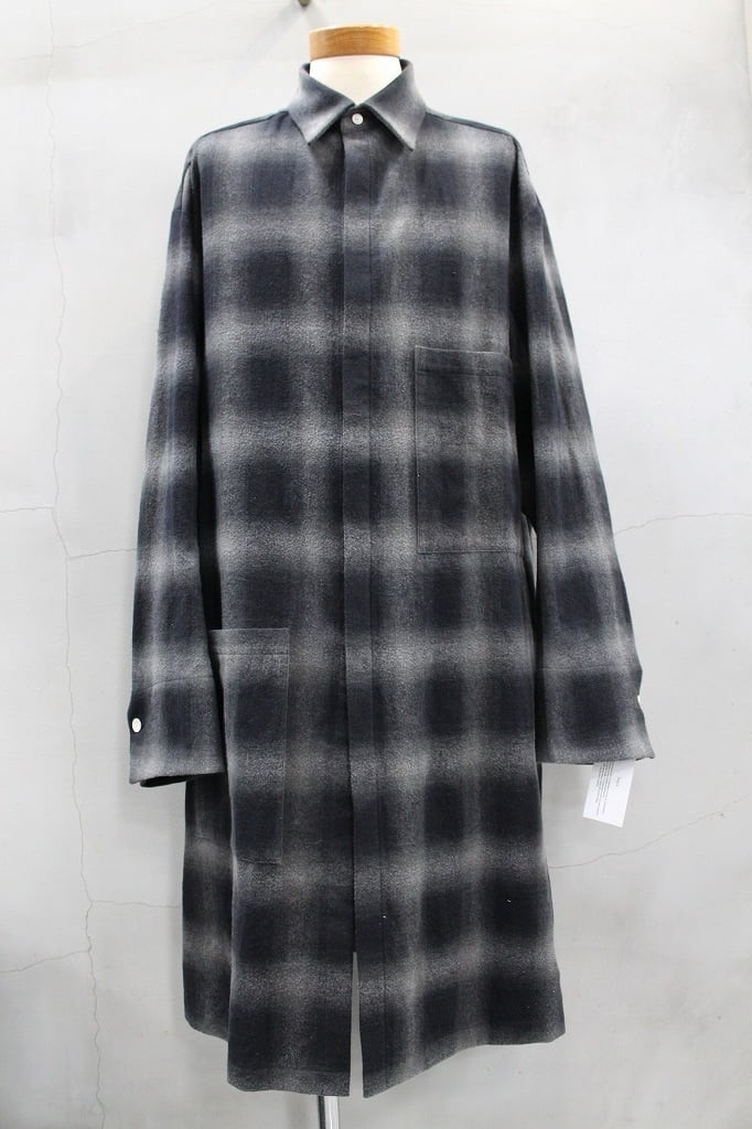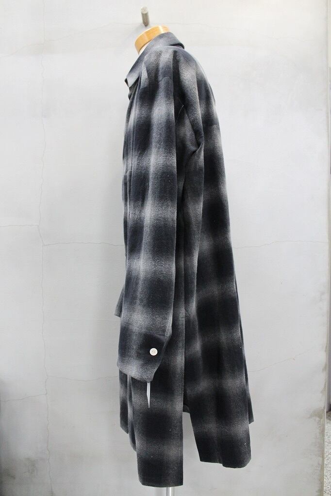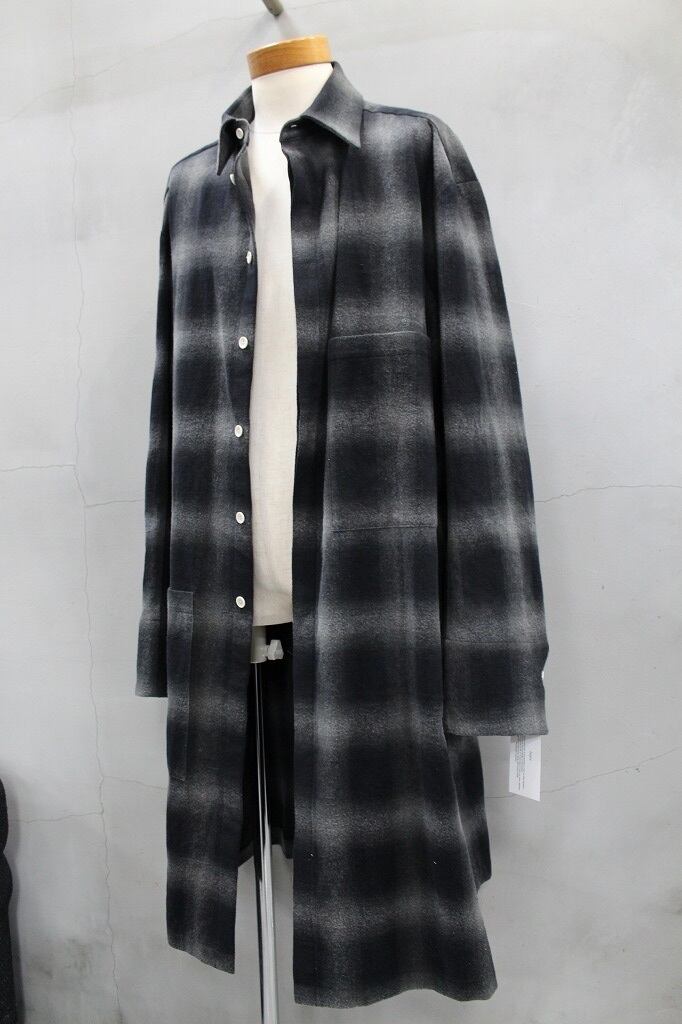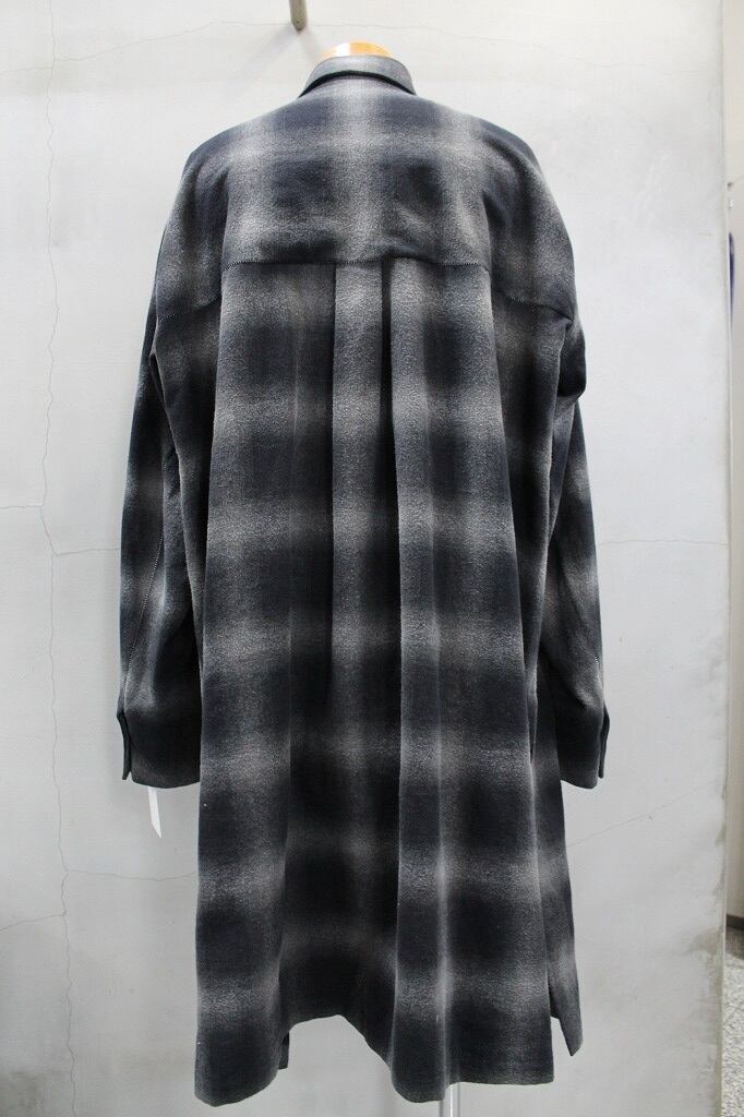 起毛感のあるオンブレーチェック生地に低濃度の黒染めを施し、オンブレーの表情をさらに深く味わいのある生地に仕上げました。しっかりとした上質な素材感と雰囲気のあるロング丈デザインは、シャツでいながらもスプリングコートのような着こなしも楽しんで頂ける1着です