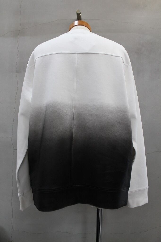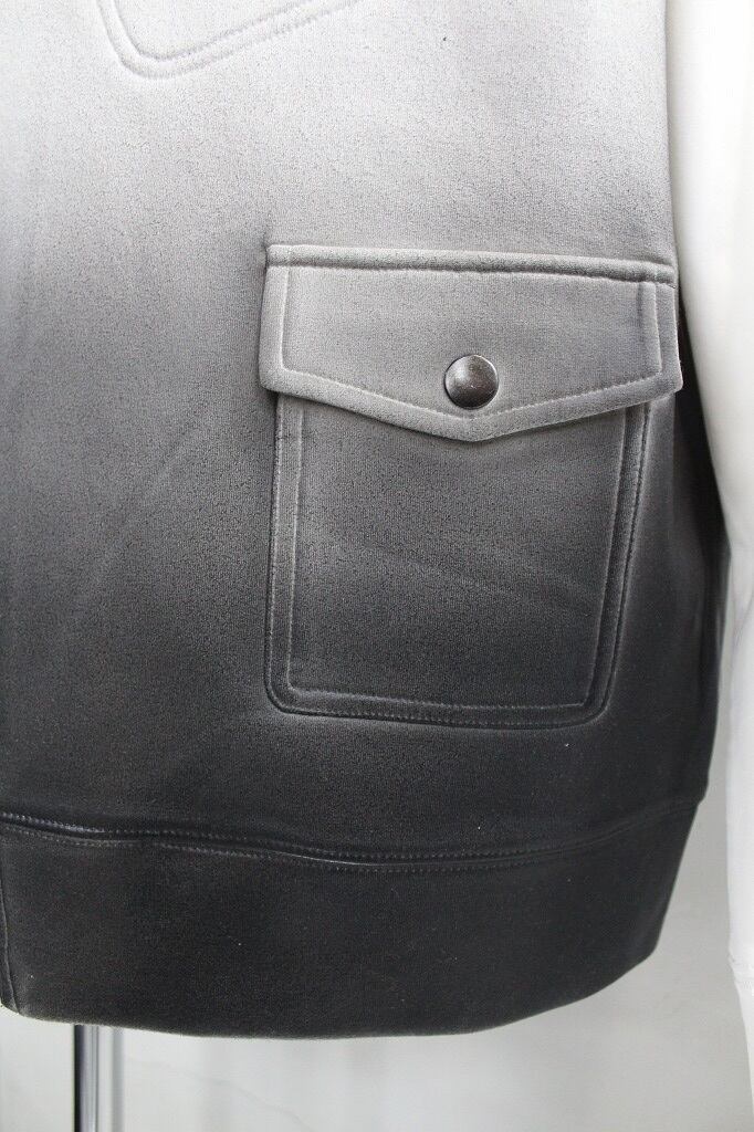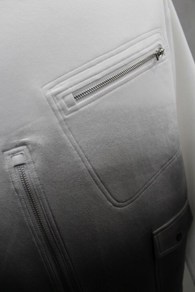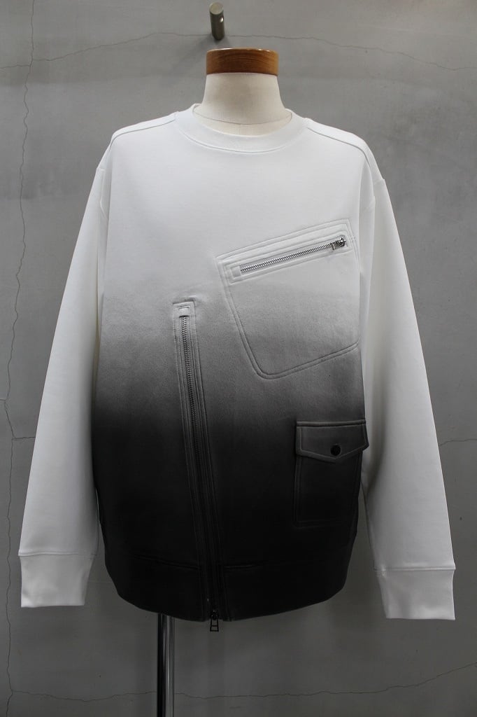 Tシャツとスウェットの中間のような肉感のコットンベース生地を使用。ダンボールニットにも近いエアリーでサラッとした質感が特徴の素材です。ロングスリーブTシャツとライダースジャケットを交差させたブランドらしいデザイン。さらにグラデーションコーティングでレザータッチな表面感をプラスさせることで独自性の高いアイテムになっています