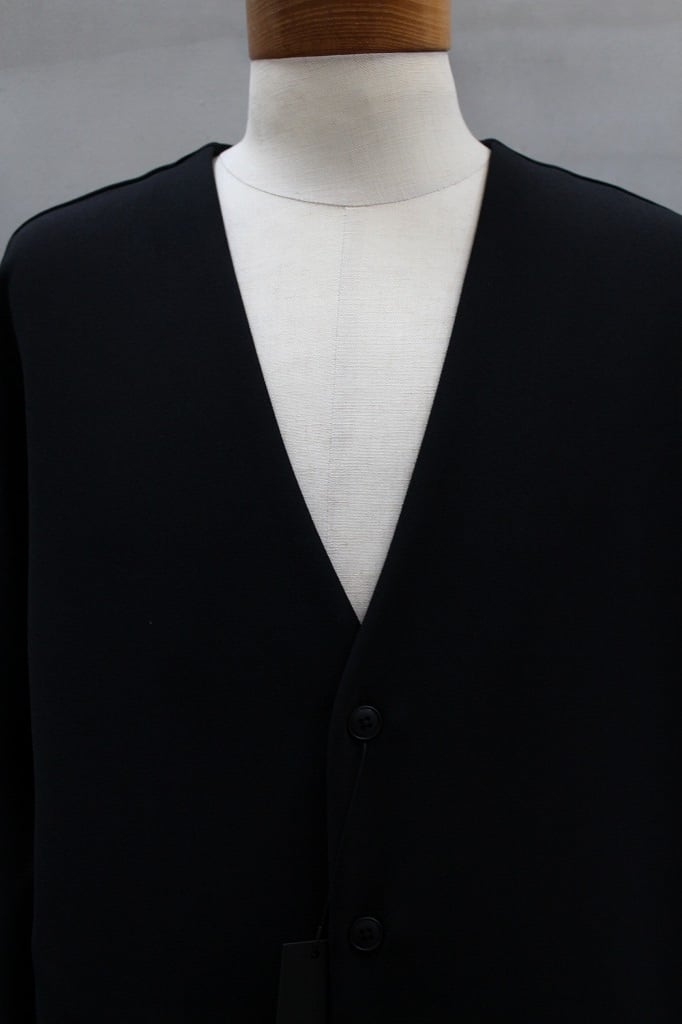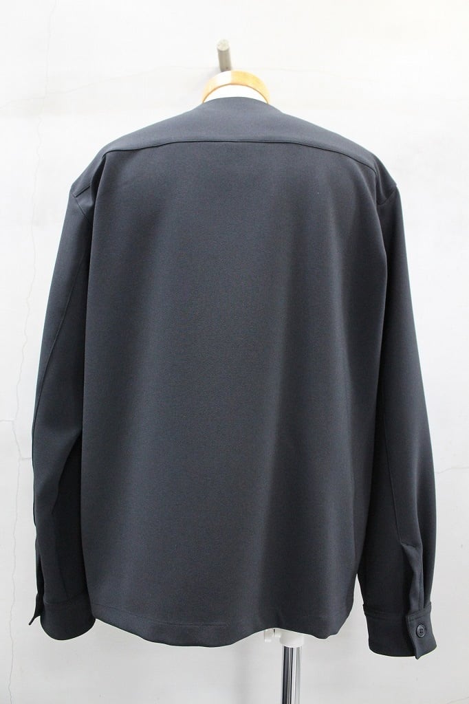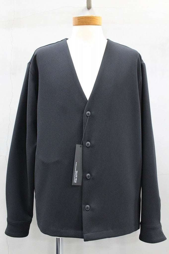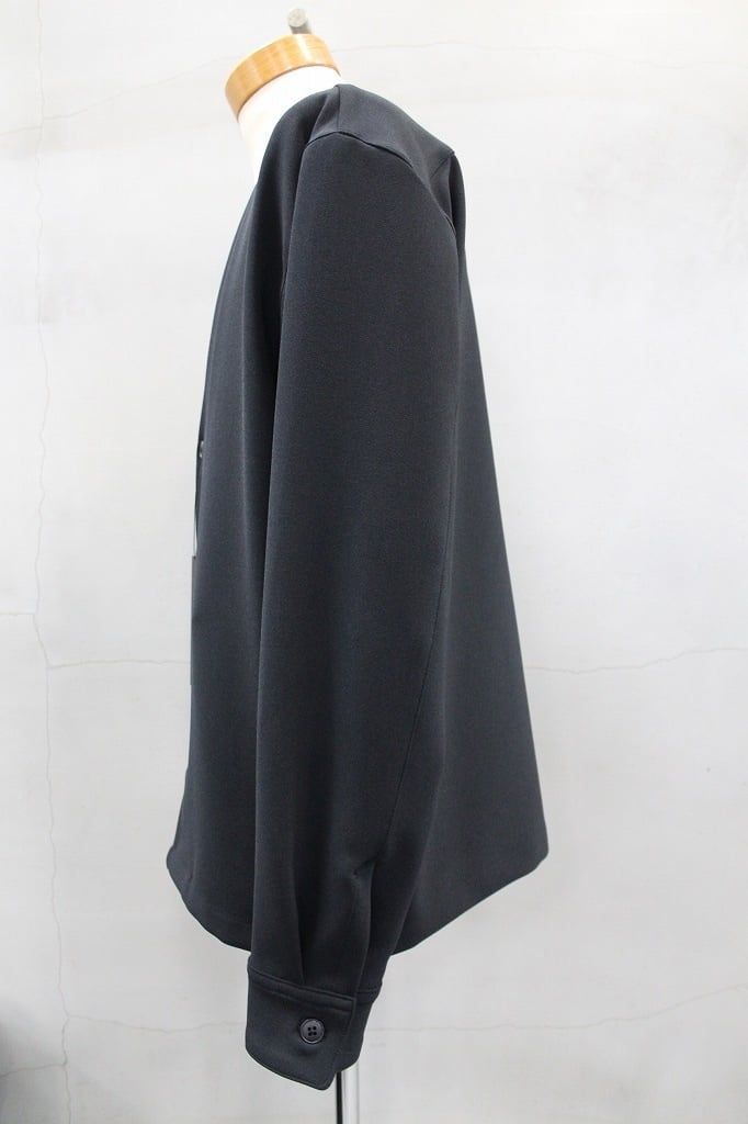 ポリエステルのフィラメント(長繊維)ながらトップ糸のようなメランジ感とパウダーな質感、膨らみがありストレッチ性も兼ね揃えた素材を用いたセットアップシリーズのカーディガンシャツジャケット。カーディガンをベースに、袖口にカフス仕様にしてシャツの感覚を取り入れたりサイドシームポケットを加えてジャケット感覚をと取り入れた多様性のアウターです。同素材のワイドパンツとのセットアップも大変おすすめです