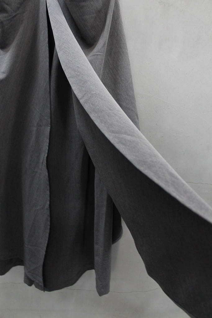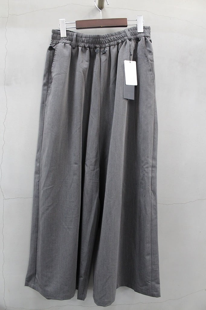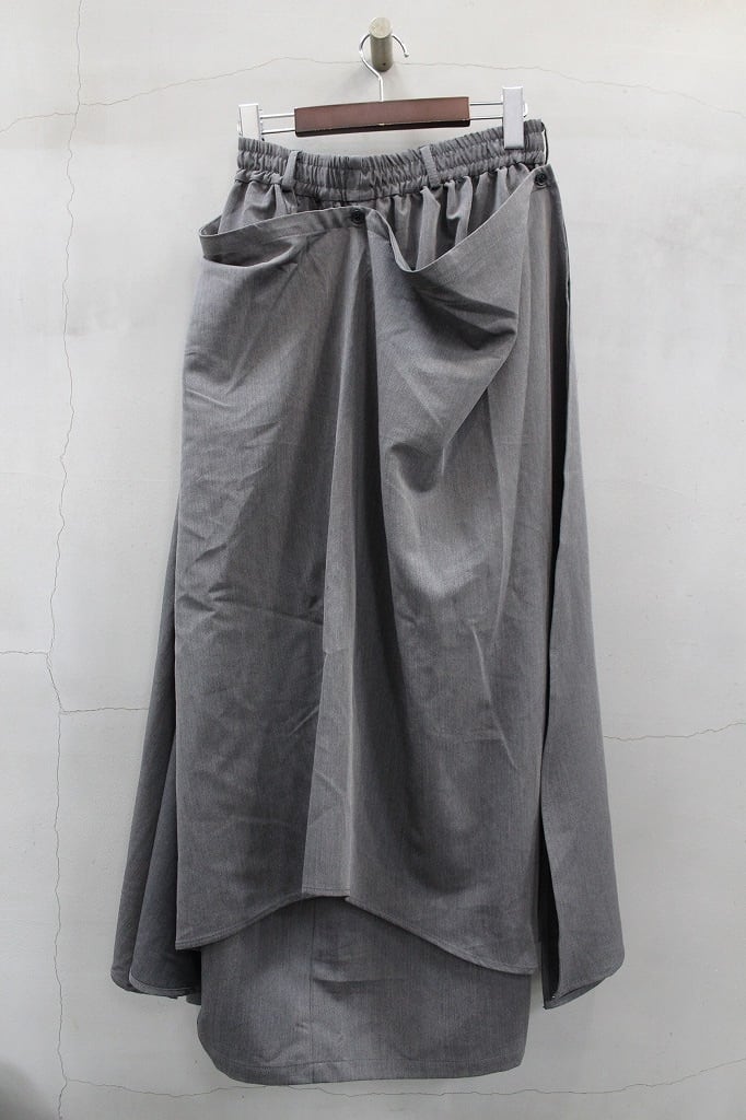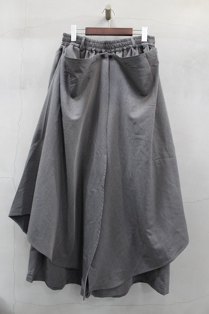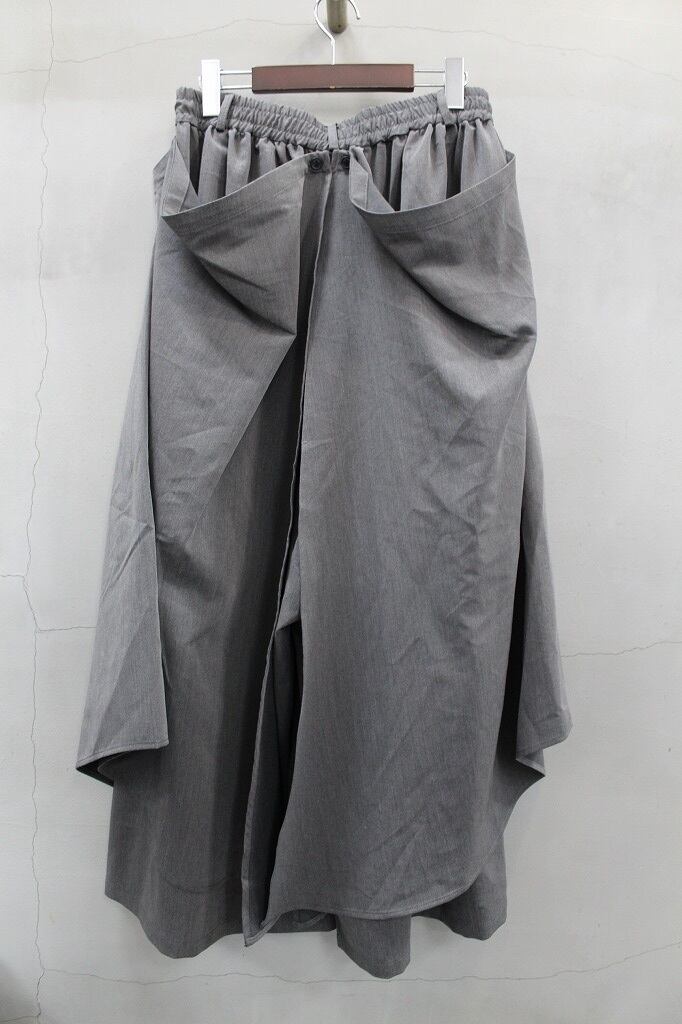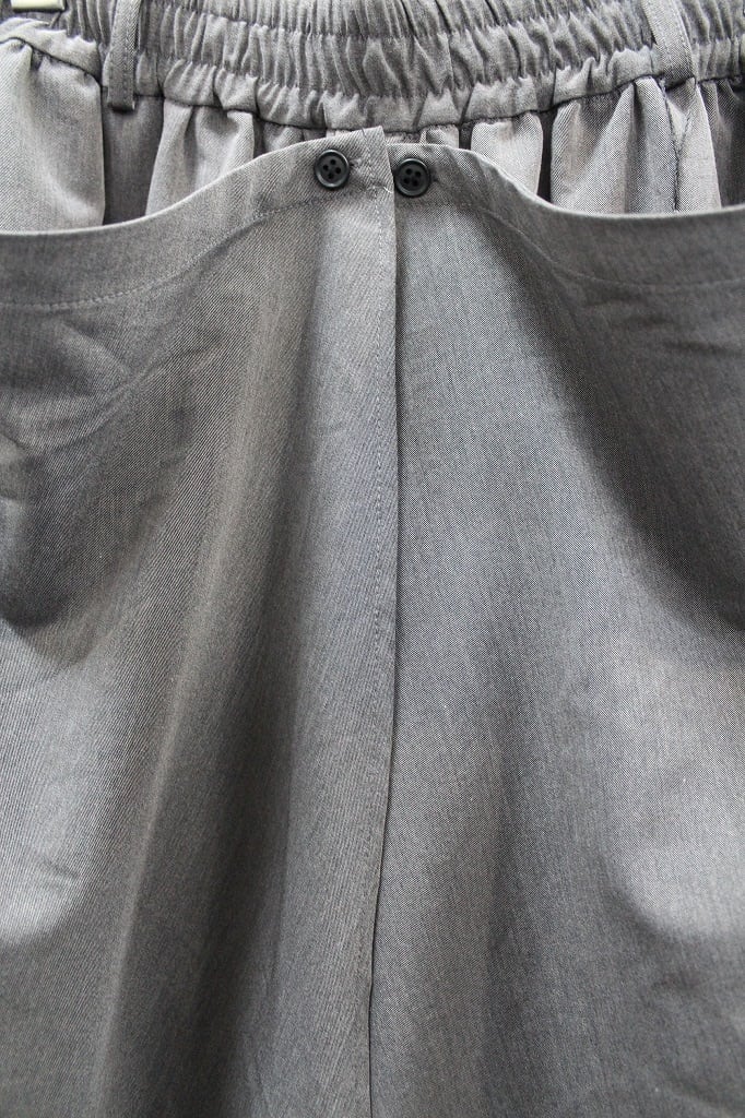 バギーシルエットのトラウザーズの上にケープを纏った躍動感のあるトラウザーズ。ケープ部分はボタンにより好みの位置で自在に調整したり、完全に取り外せるなどで様々なドレープの変化やまったく別のパンツのようにも楽しめる一本。ウエストゴム仕様にベルトループも付属しています