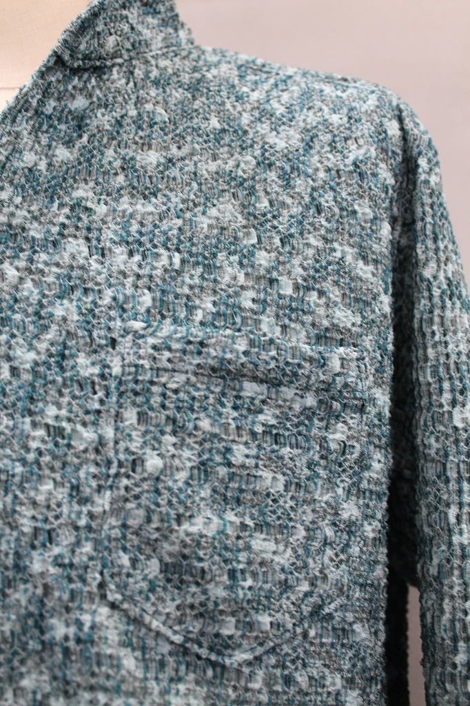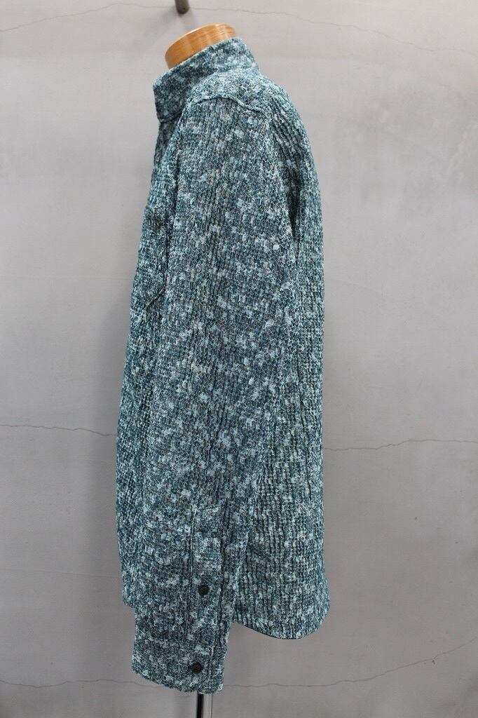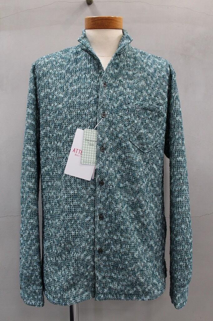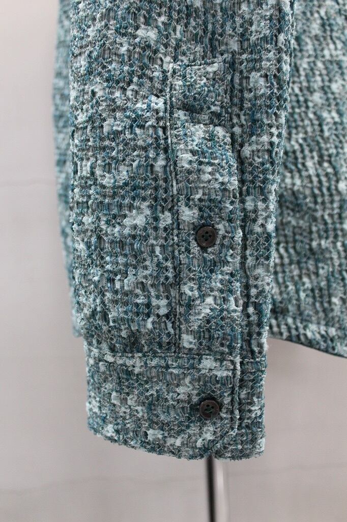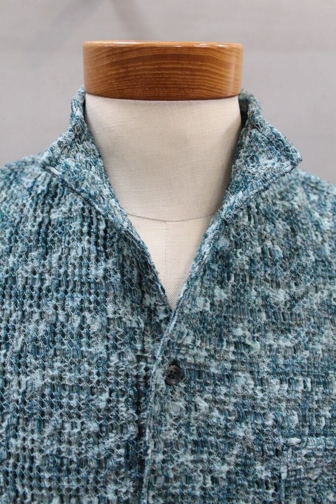ポコポコしたオウトツ感のある組織と何色も混じった様な綺麗な色目とテンションのあるマルチストレッチが特徴のジャガード織り素材を使用。衿端にワイヤ-を仕込んだショートスタンド・イタリアンカラ-シャツです