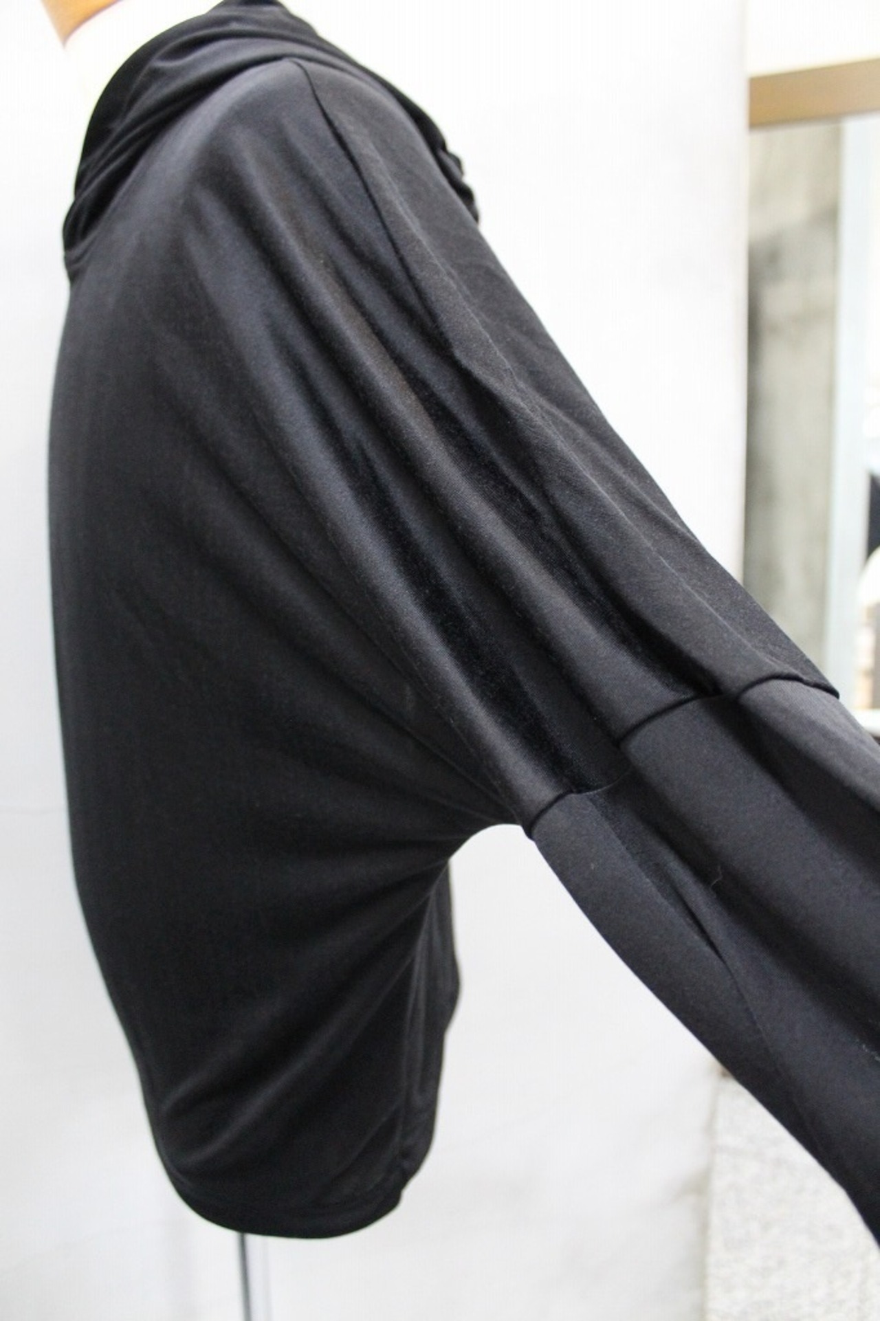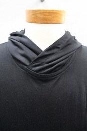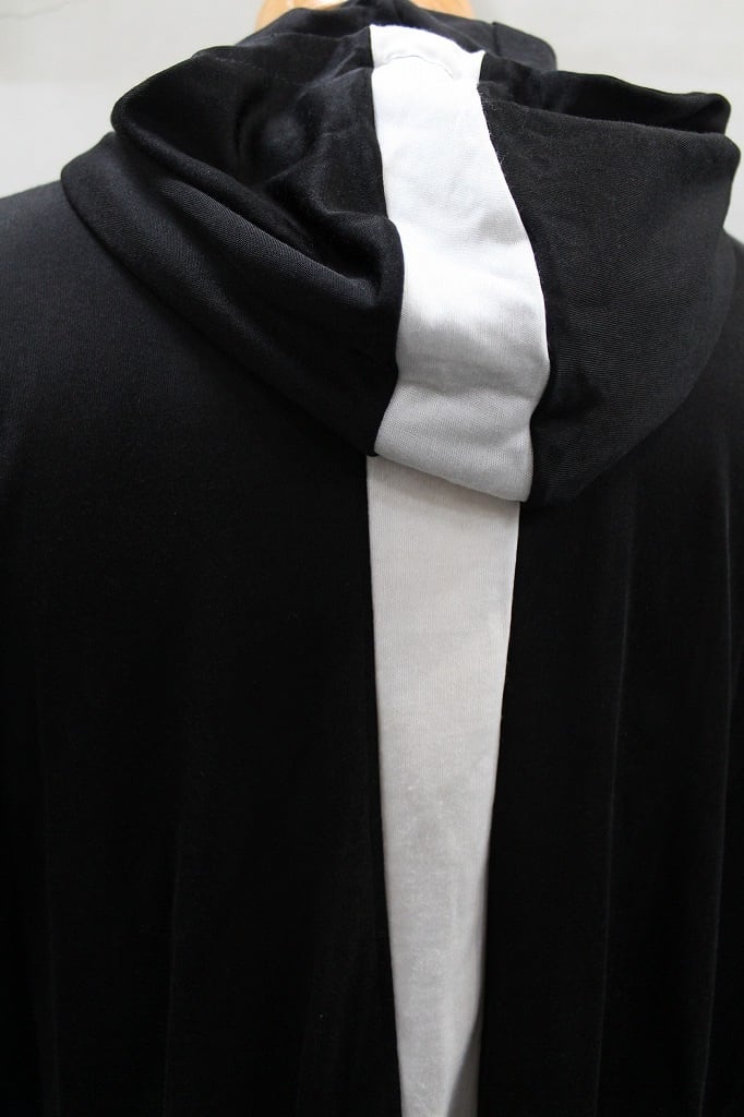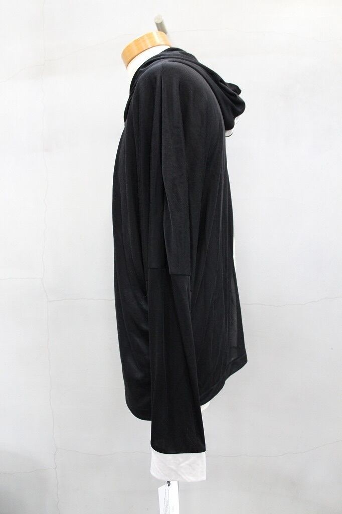 シルクのような光沢、肌触りの良さ、優れた吸湿性・放湿性が特徴のキュプラフライス素材を使用したプルオーバーフーディ。透け感のある薄さと軽さ、とろみのある上品なドレープ感が魅力のフーディにフード後ろから背中中心に巾広のバックラインを加えたデザインが、「黒」を軽くしています。ドロップショルダーにややドルマン調の脇下のシルエットが特徴です
