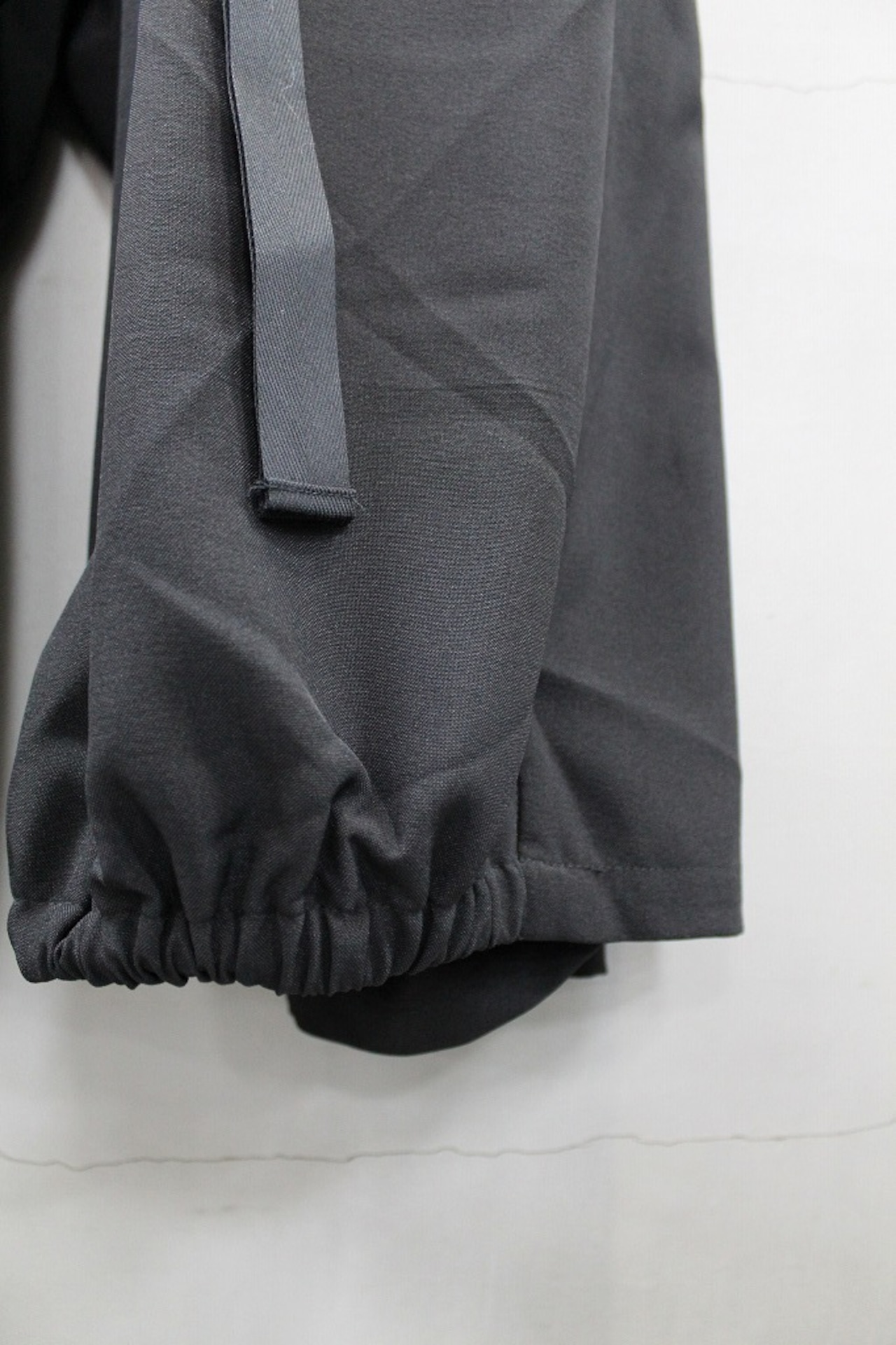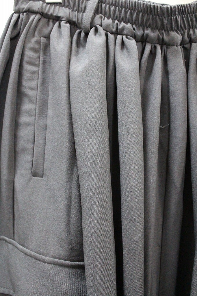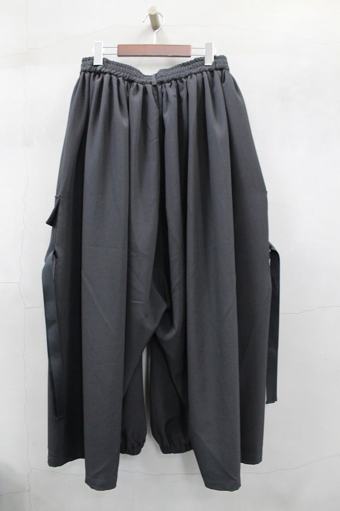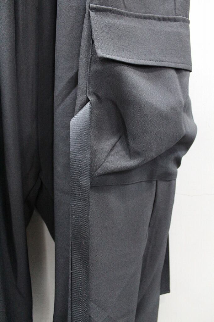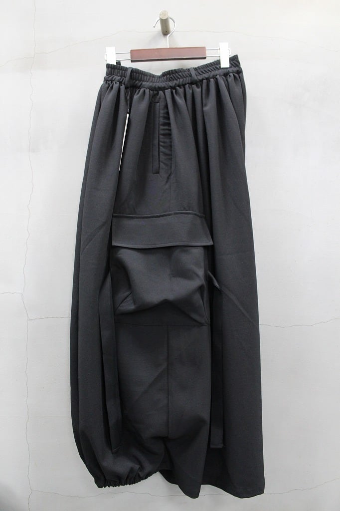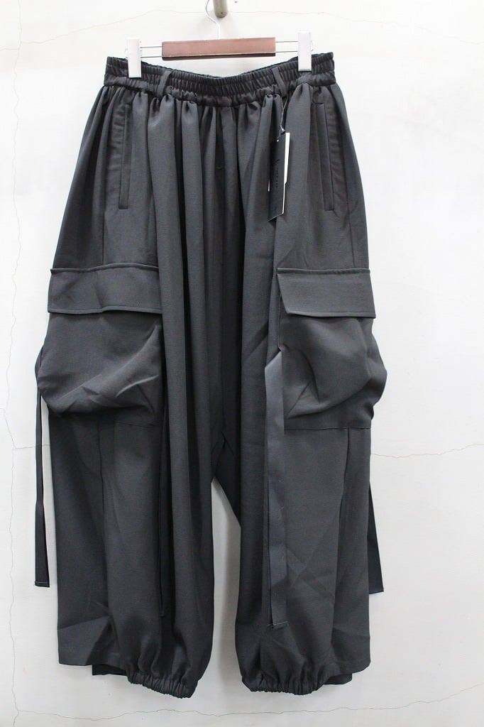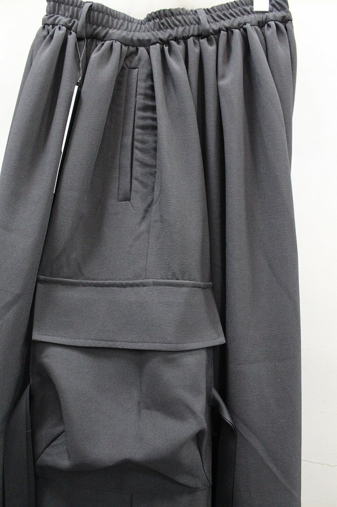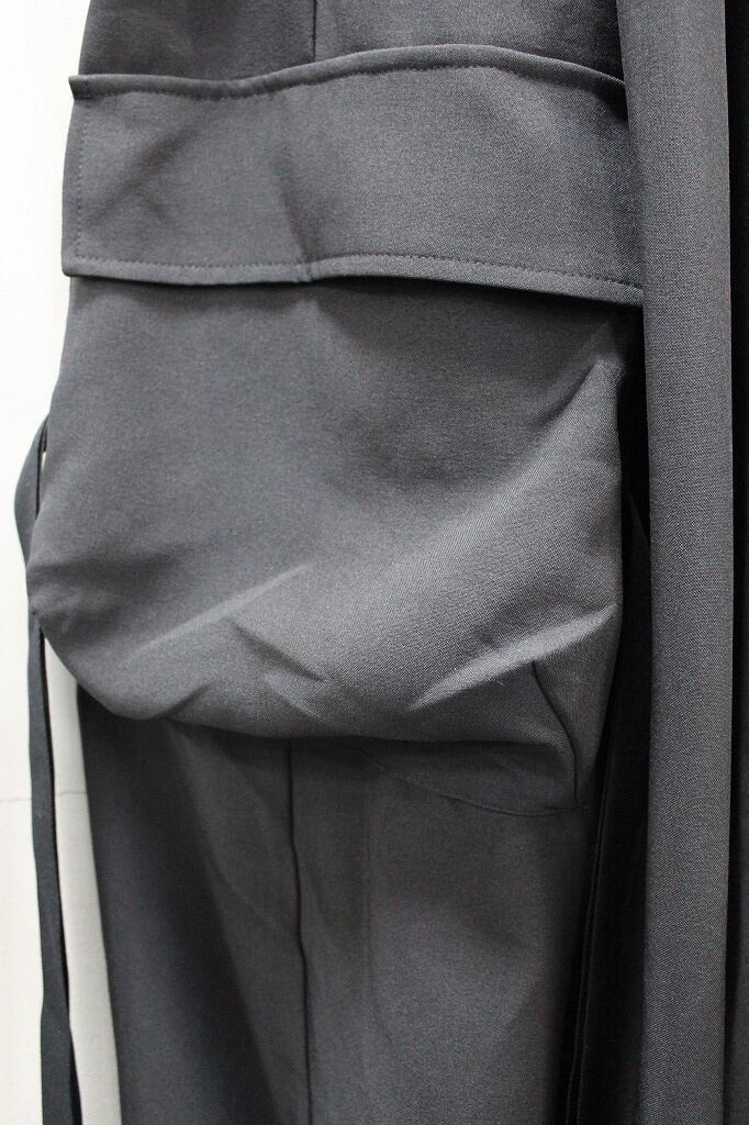 裾口ゴムとフラットな裾口を二つに分ける事で躍動感のあるドレープを表現したトラウザーズ。今季はカーゴポケットを配してミリタリー要素をプラス。同生地のモーニングジャケットとのセットアップ対応になります