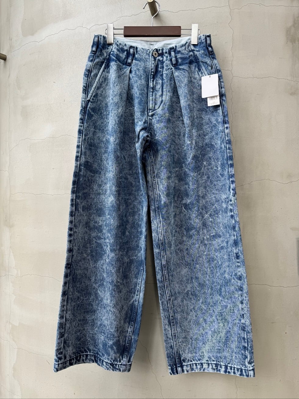 ケミカルブリーチ加工を施した12ozデニムを使用し、ワンタックワイドタイプに仕上げた新作デニムパンツです。独特の色落ちとムラ感が特徴のブリーチ加工を採用。一点一点異なる表情が魅力で、他にはない存在感のある一本に仕上がっています。