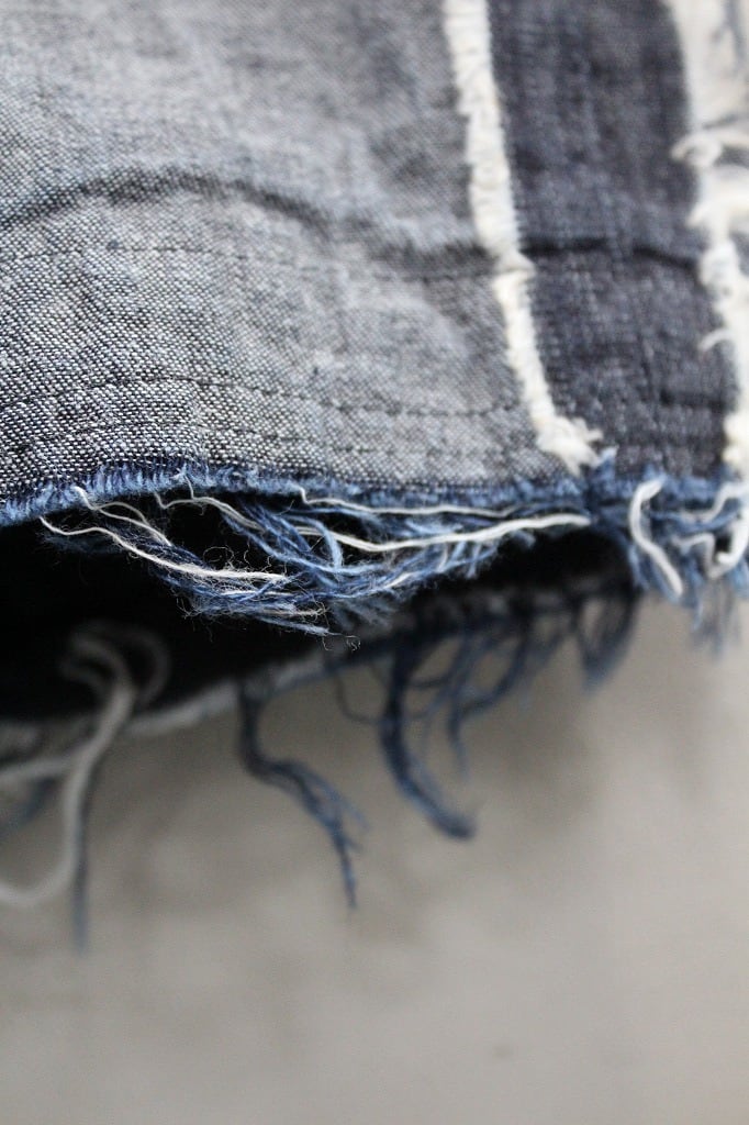 裾を折り返したようなデザインが印象的なデニムパンツ。デニムの裏面を使用し、素材の表情に変化をつけました。切替部分と裾にはほつれを施し、ラフなニュアンスをプラス。サイドにはあえて縫い代を見せることで、折り返したような立体感のあるデザインに仕上げています。