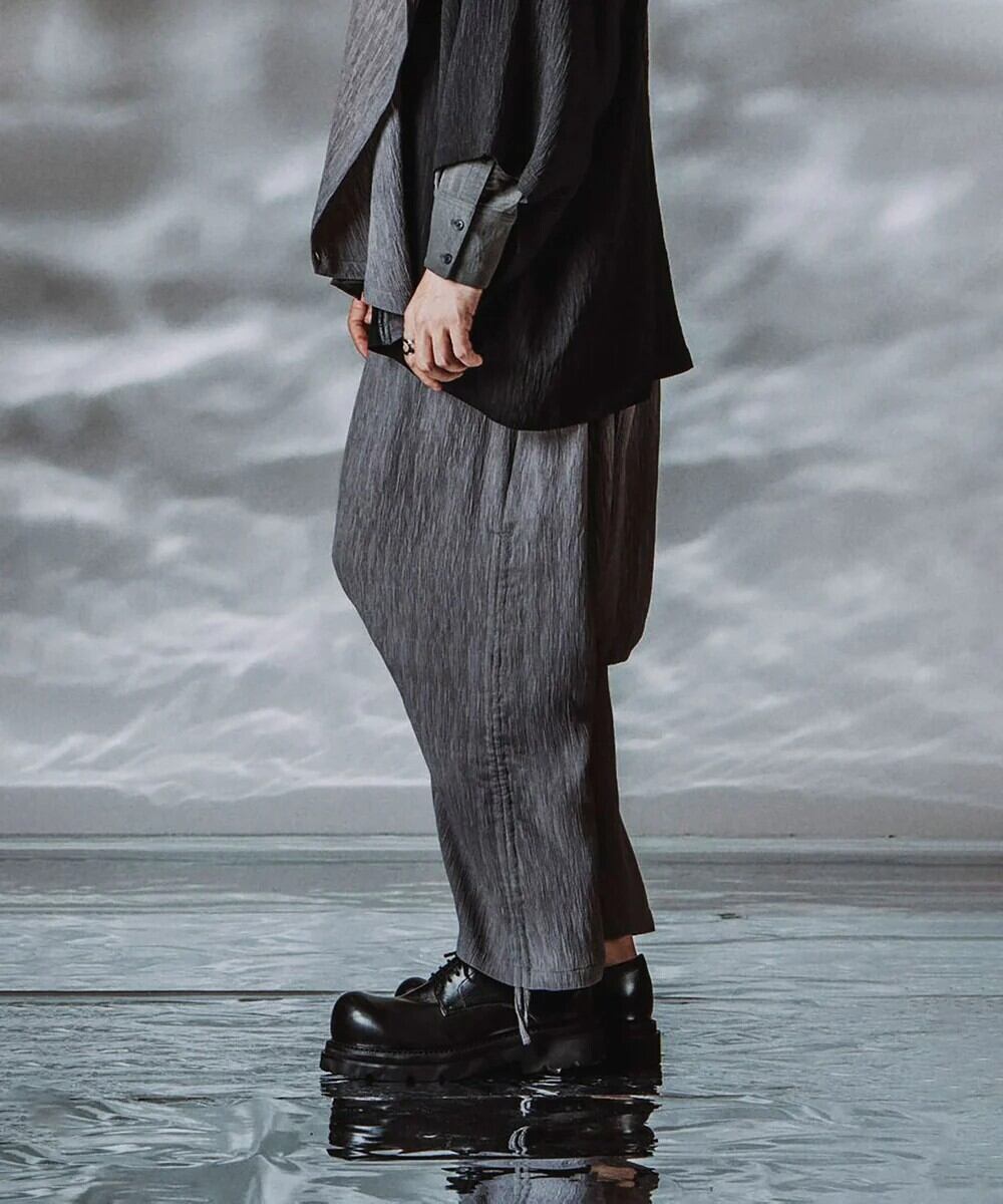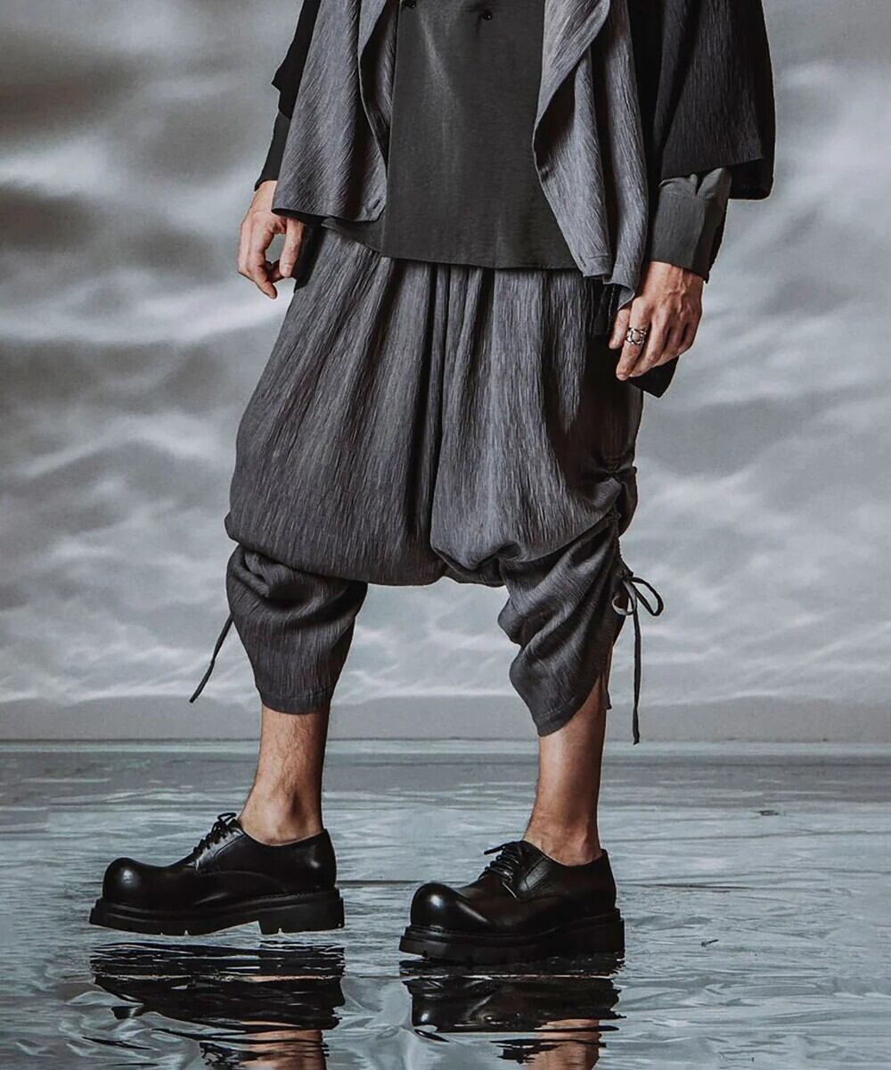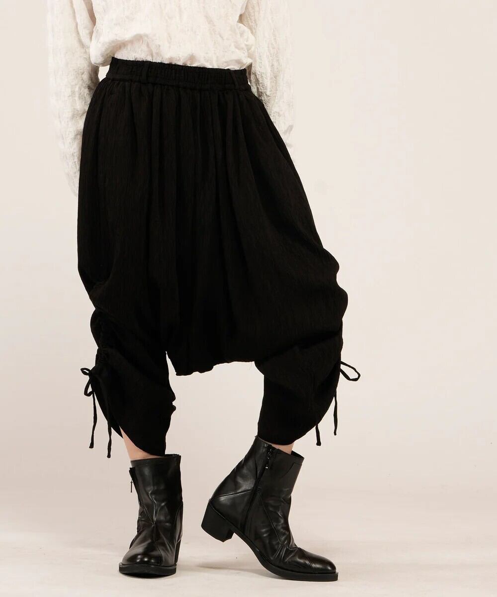 非常に深い股上が特徴のサルエルトラウザーズ。生地の分量が多くヒップラインから太ももの極端なワイドシルエットから裾に向かって細くなるデザイン。ドレープや落ち感による動きのある表情が特徴の素材は通気性も高く涼しくお使い頂けます。裾のドローストリングスによりアレンジも可能で、暑い季節に応じたコーディネートが可能です