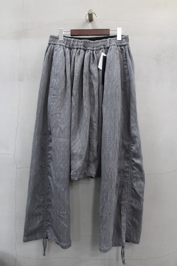 非常に深い股上が特徴のサルエルトラウザーズ。生地の分量が多くヒップラインから太ももの極端なワイドシルエットから裾に向かって細くなるデザイン。ドレープや落ち感による動きのある表情が特徴の素材は通気性も高く涼しくお使い頂けます。裾のドローストリングスによりアレンジも可能で、暑い季節に応じたコーディネートが可能です