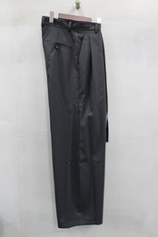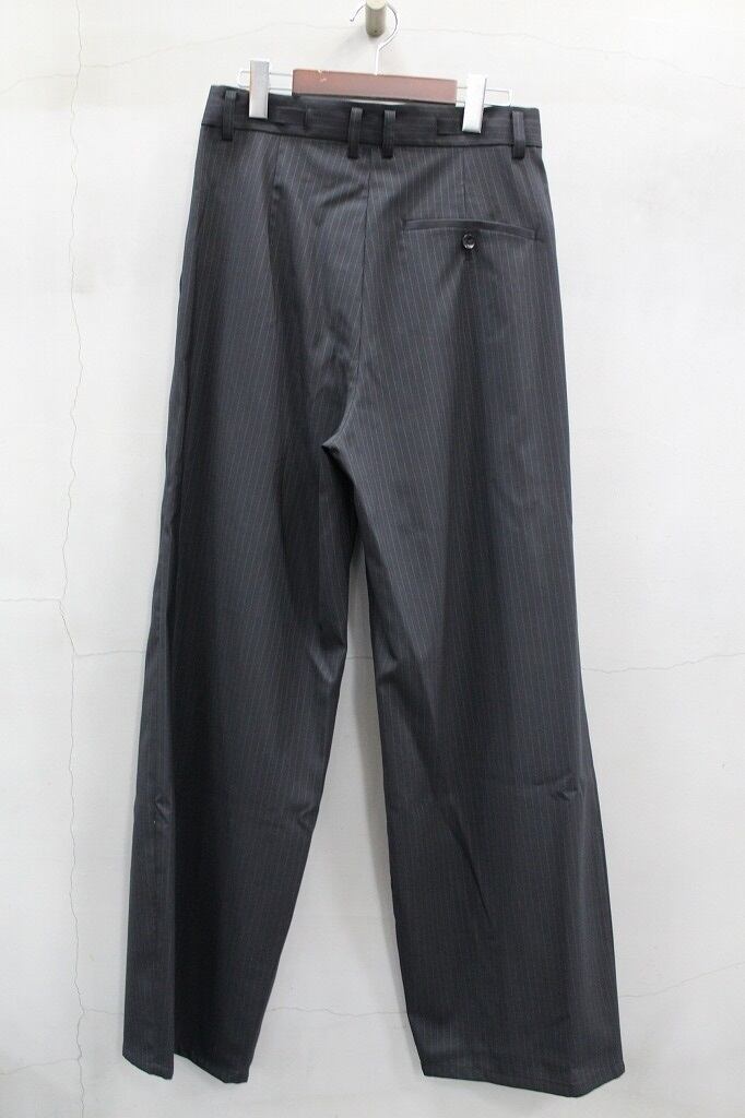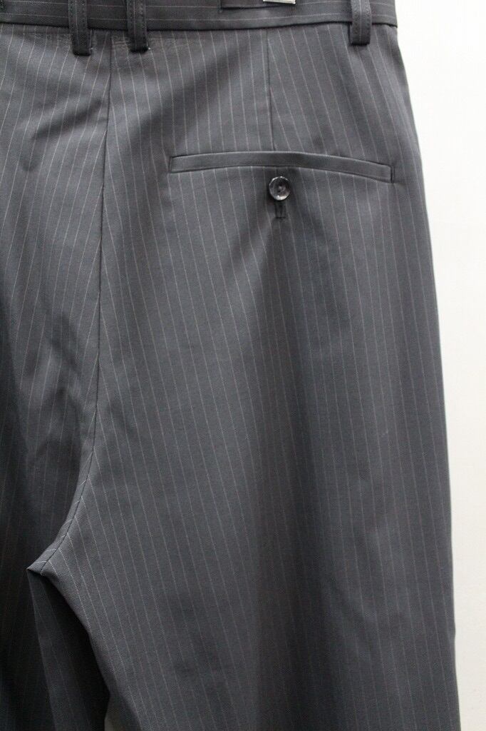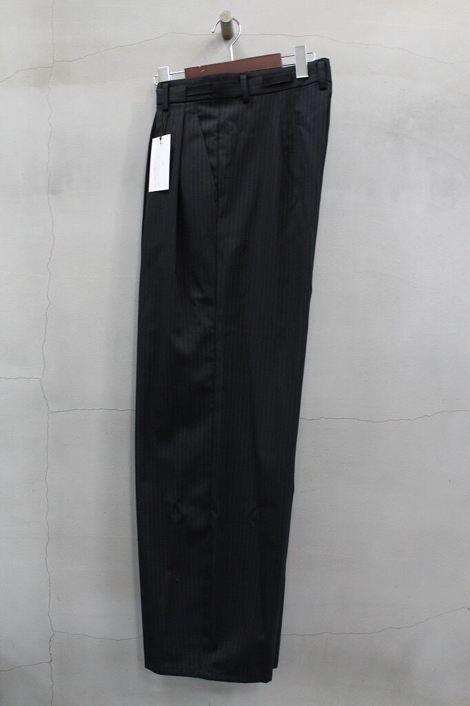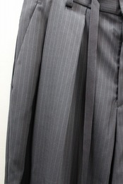 細番糸ストライプのドレス風素材のワイドパンツ。裾に向かって軽くテーパードを入れシルエットに膨らみを持たせ、生地が薄手のため非常に動きの出やすいパンツです。正統派にも着崩し派にもオススメしたい綺麗目パンツです