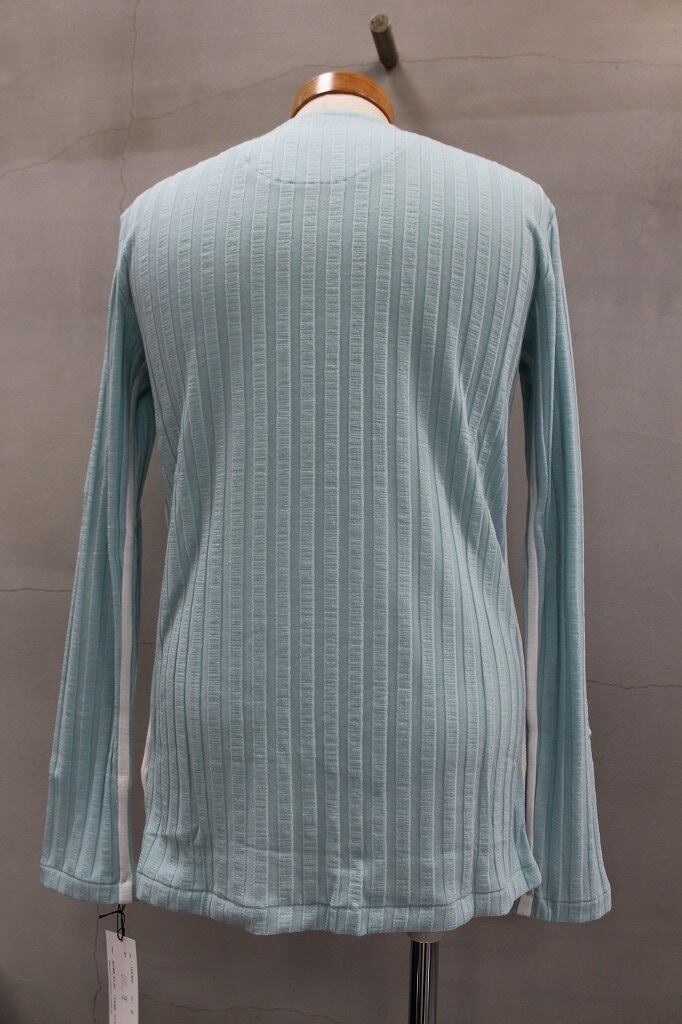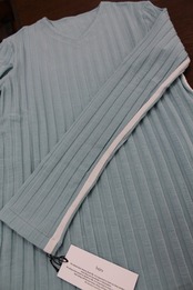 肌当たりと滑りの良いテンセルストレッチのワイドリブを使用したVネックカットソーです。畦が太くはっきりとパターンの浮き上がるワイドリブの表情が特徴的。両脇と内袖に細幅のラインを配置。体のラインに沿うタイトフィットタイプです。