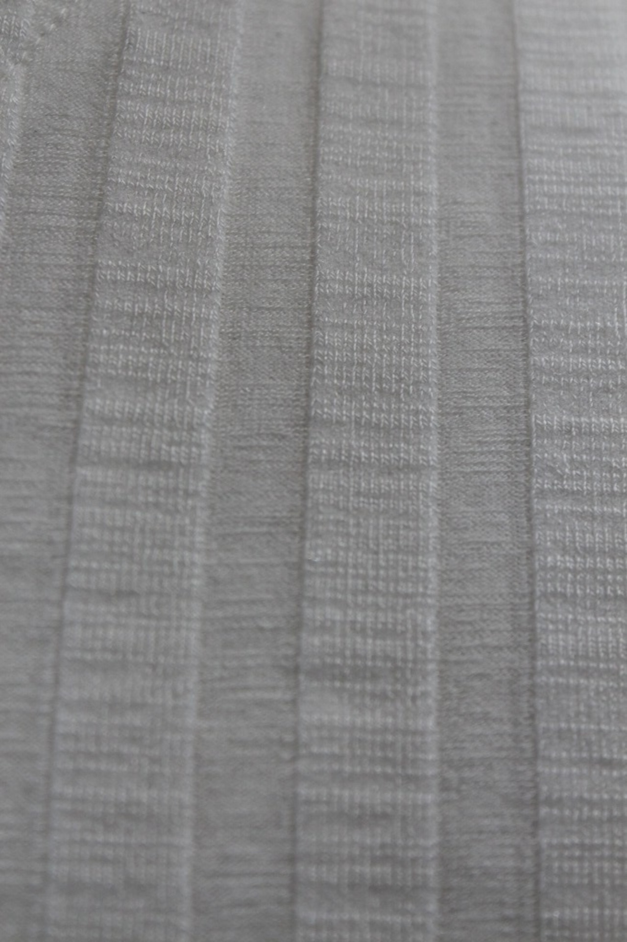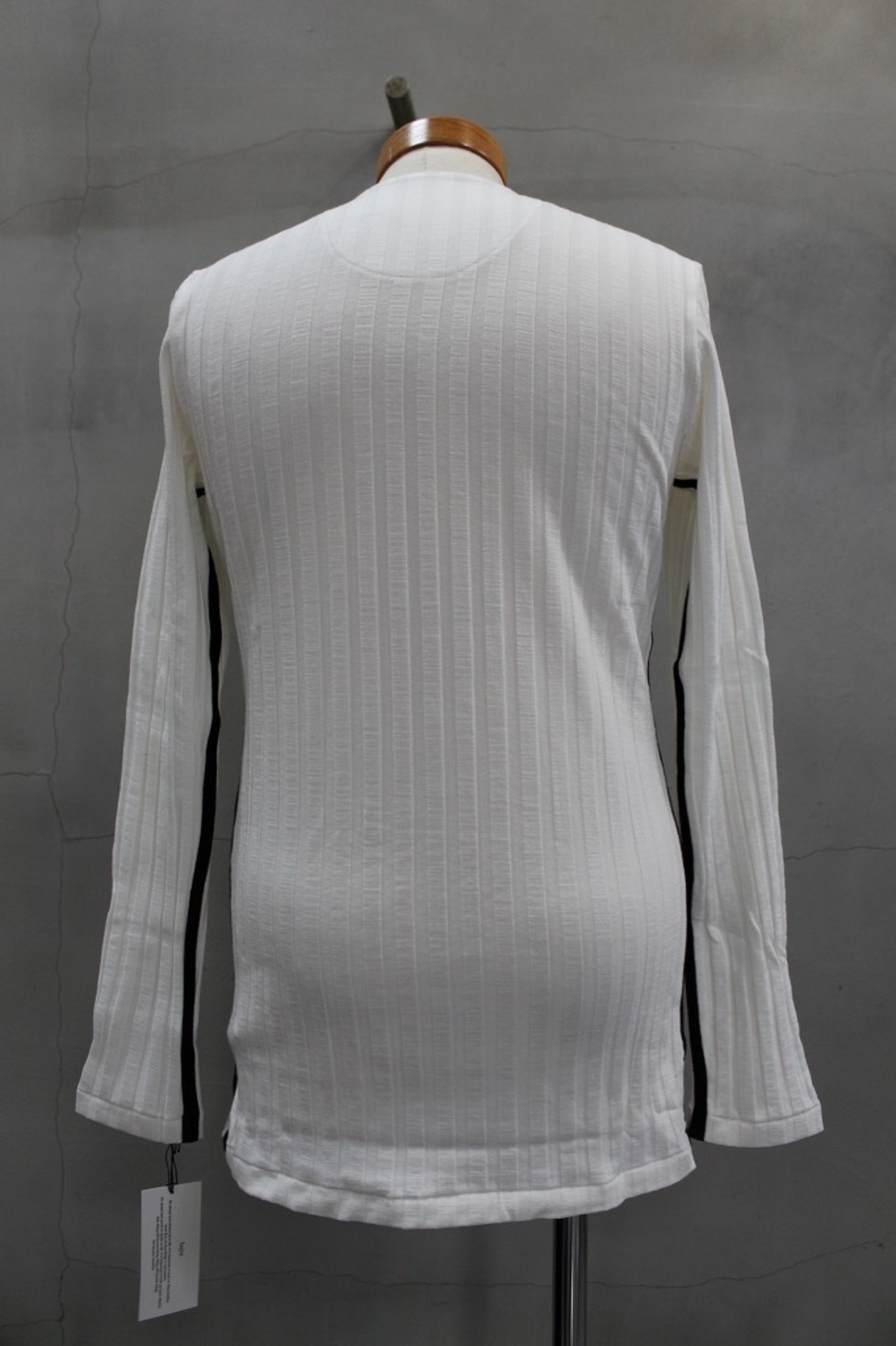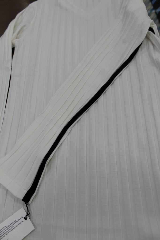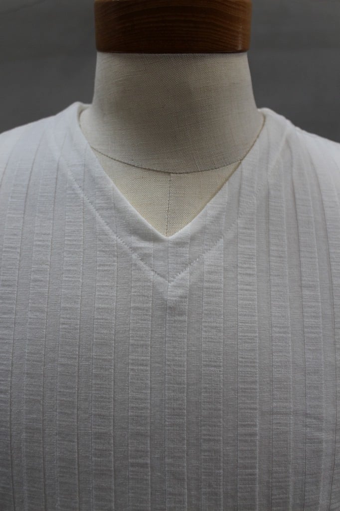 肌当たりと滑りの良いテンセルストレッチのワイドリブを使用したVネックカットソーです。畦が太くはっきりとパターンの浮き上がるワイドリブの表情が特徴的。両脇と内袖に細幅のラインを配置。体のラインに沿うタイトフィットタイプです。