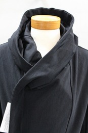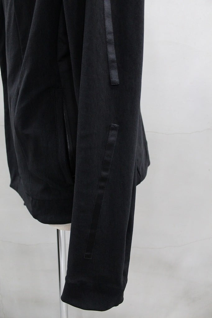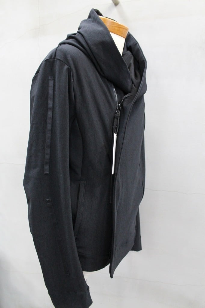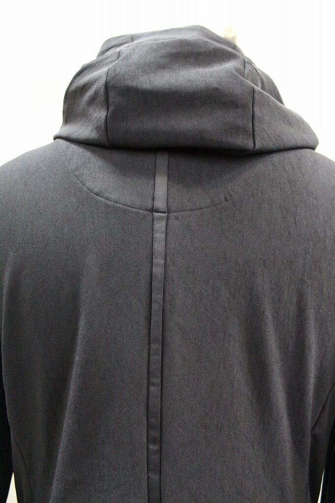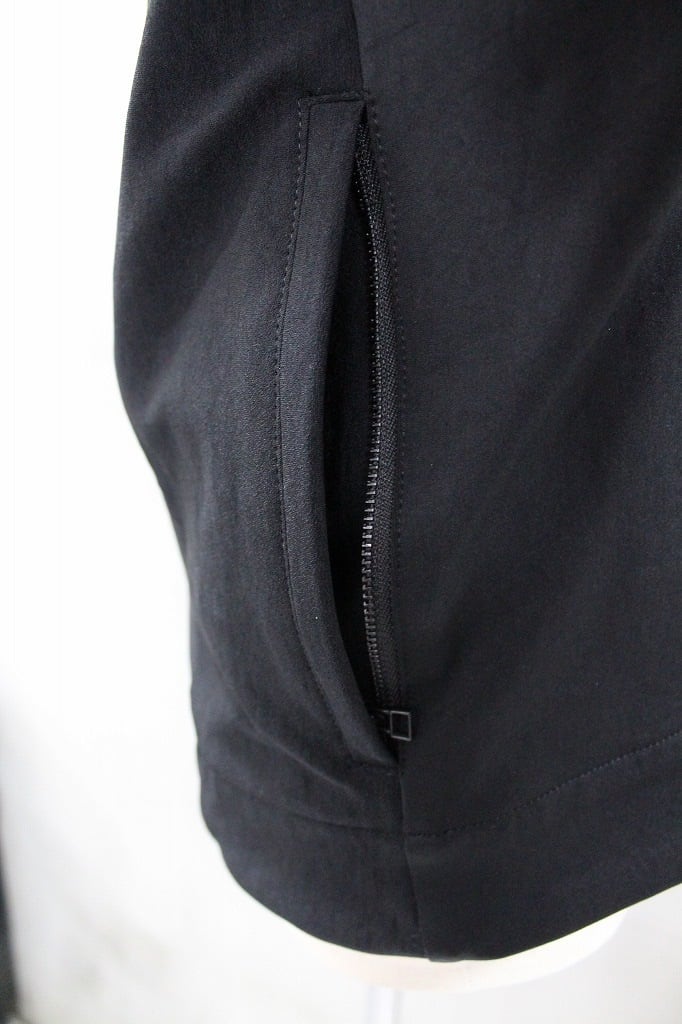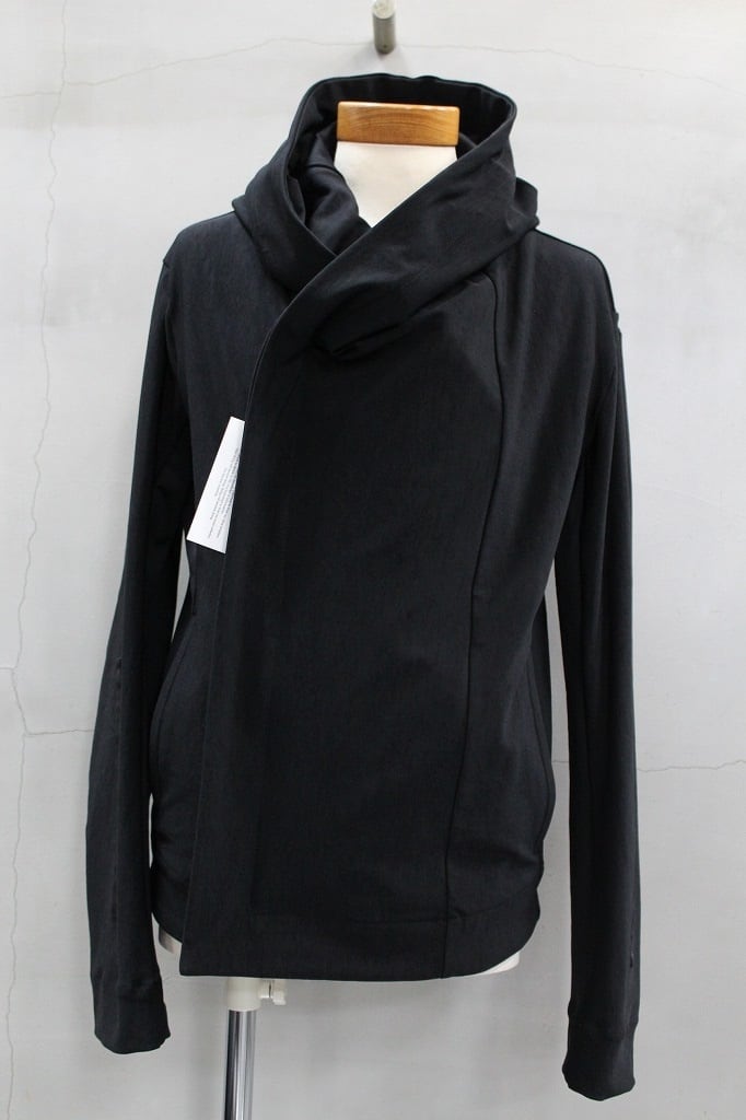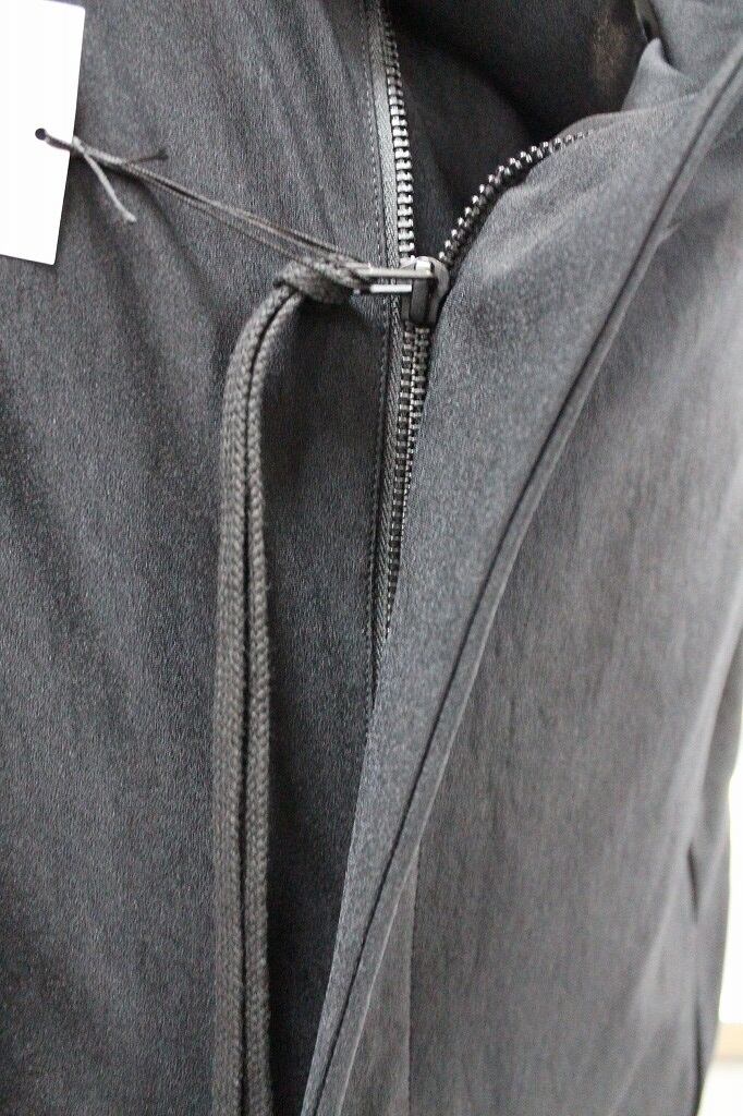 ナイロン✕ポリウレタンのゴムのようにしなやかに伸縮するハイテンション生地を使用。塩類の水溶液の中に生地を浸し収縮させることで凹凸やシワを作り出す塩縮加工を加え黒の中にも微妙な表情を生み、味わいを高めたビッグフードブルゾンです。フロントの掛け合わせを深くクロスさせたラップタイプは、前を開けて着流しでの着用もサマになるブルゾンとしてバジュラでは長く人気のモデルです